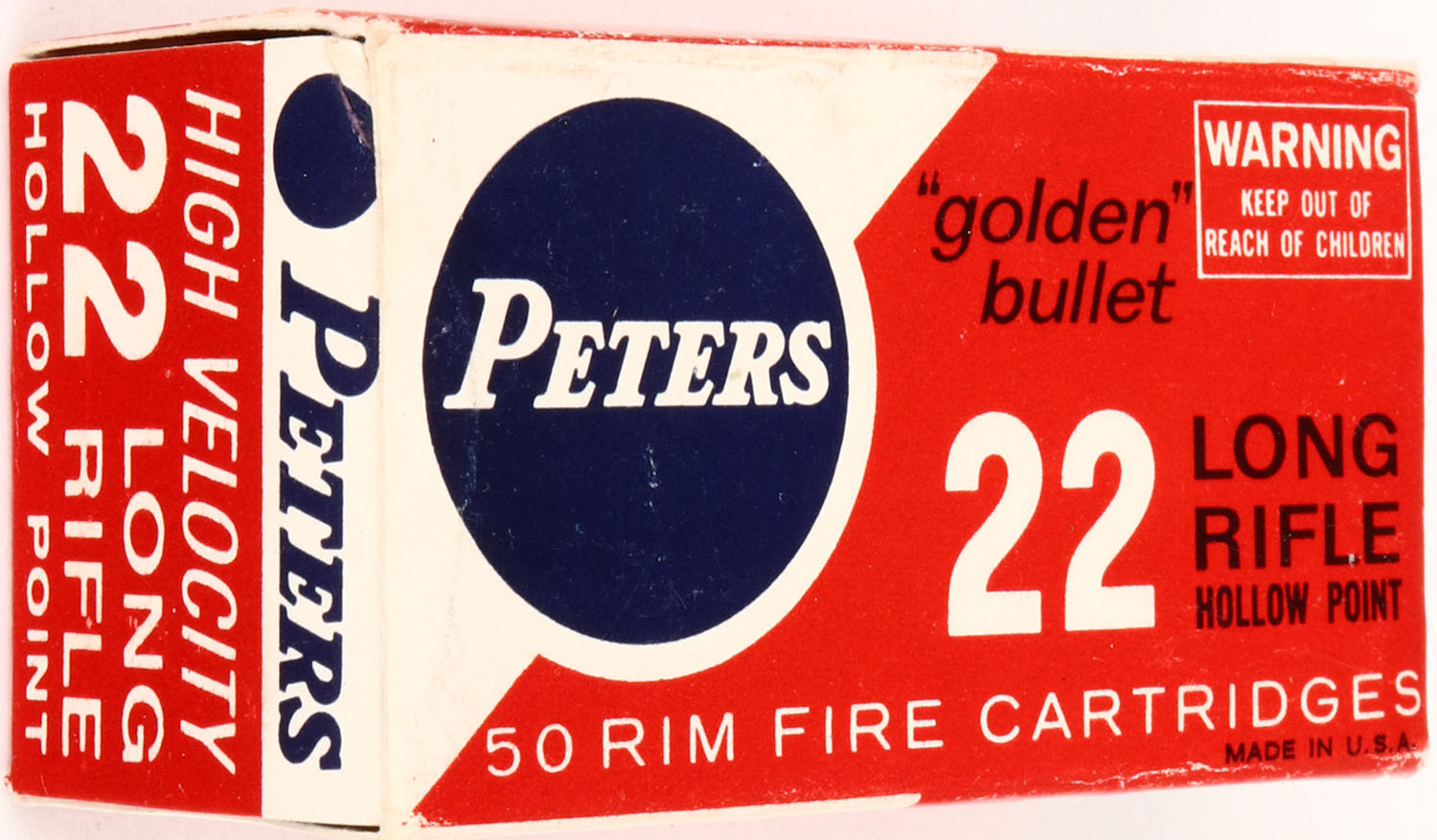 Peters, ''Golden Bullet'', .22 Long Rifle Hollow Point, RHWeb: PCC-20 LR-2, Full, 1pc. Red white & blue box, box is solid with excellent color, some shelf & corner wear, edges are crisp, end flaps are solid, ammo is very good to excellent. Grade: Excellent - Value: 2 to 20