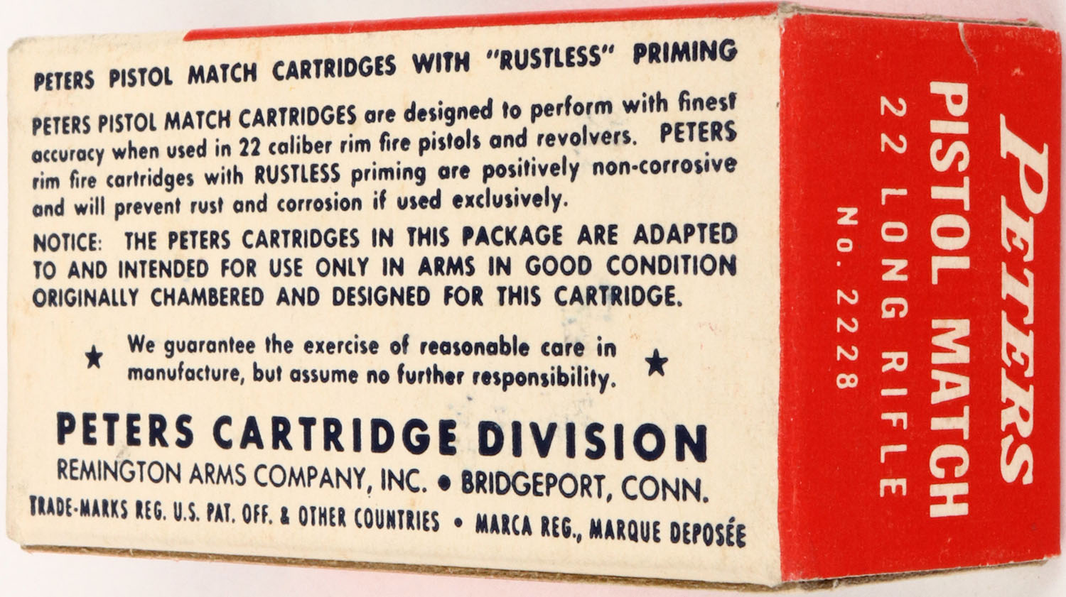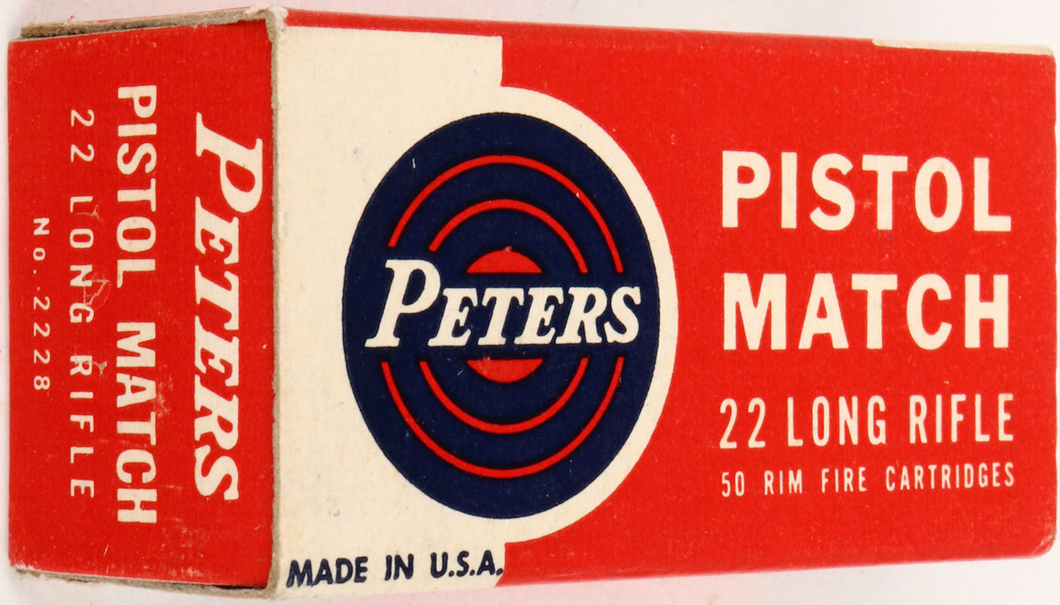 Peters, Pistol Match, .22 Long Rifle, RHWeb: PCC-55 LR-3, Full, 1pc. Red white & blue box, box is mint with minty color, corners are sharp, edges are crisp, end flaps are very rigid, ammo is excellent. Grade: Mint - Value: 10 to 50