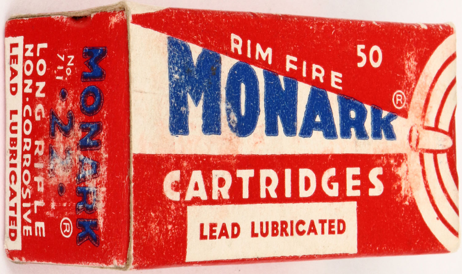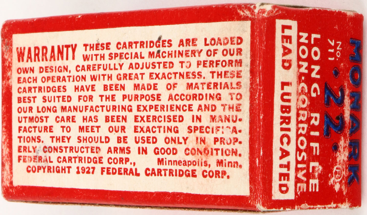 Federal, Monark, .22 Long Rifle, RHWeb: FED-5 LR-3a, Full, 1pc. Red white & blue box, box is solid with excellent color, very minor age soiling, some shelf & corner wear, edges are mostly crisp, end flaps are solid, ammo is excellent. Grade: Excellent + - Value: 2 to 20