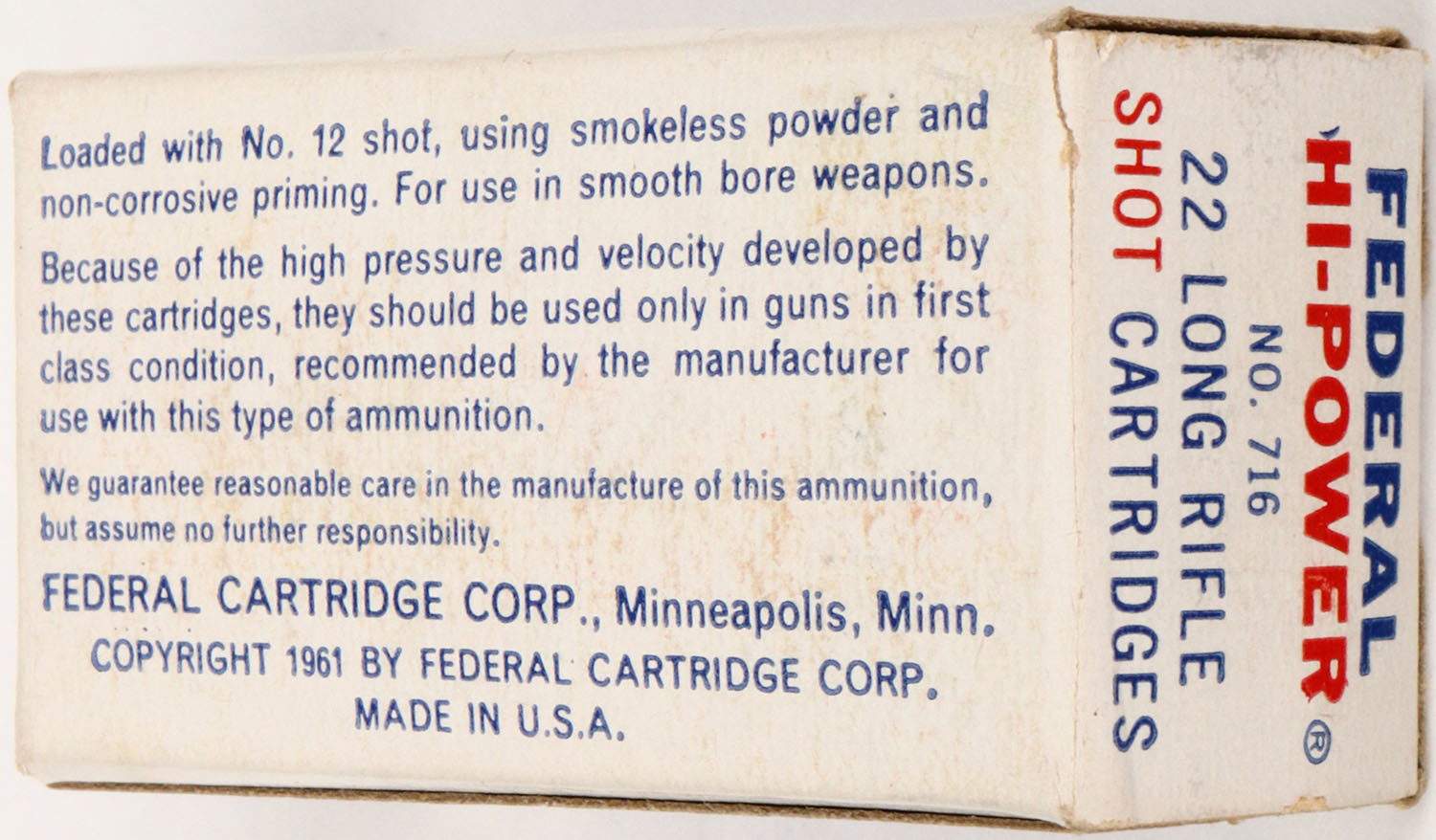 Federal, Hi-Power, .22 Long Rifle Shot, RHWeb: FED-8 LR-5a, Partial 43rds., 1pc. White blue & red box, box is solid with excellent color, very minor age soiling, corners are mostly sharp, edges are crisp, end flaps are rigid, ammo is excellent. Grade: Excellent ++ - Value: 2 to 40