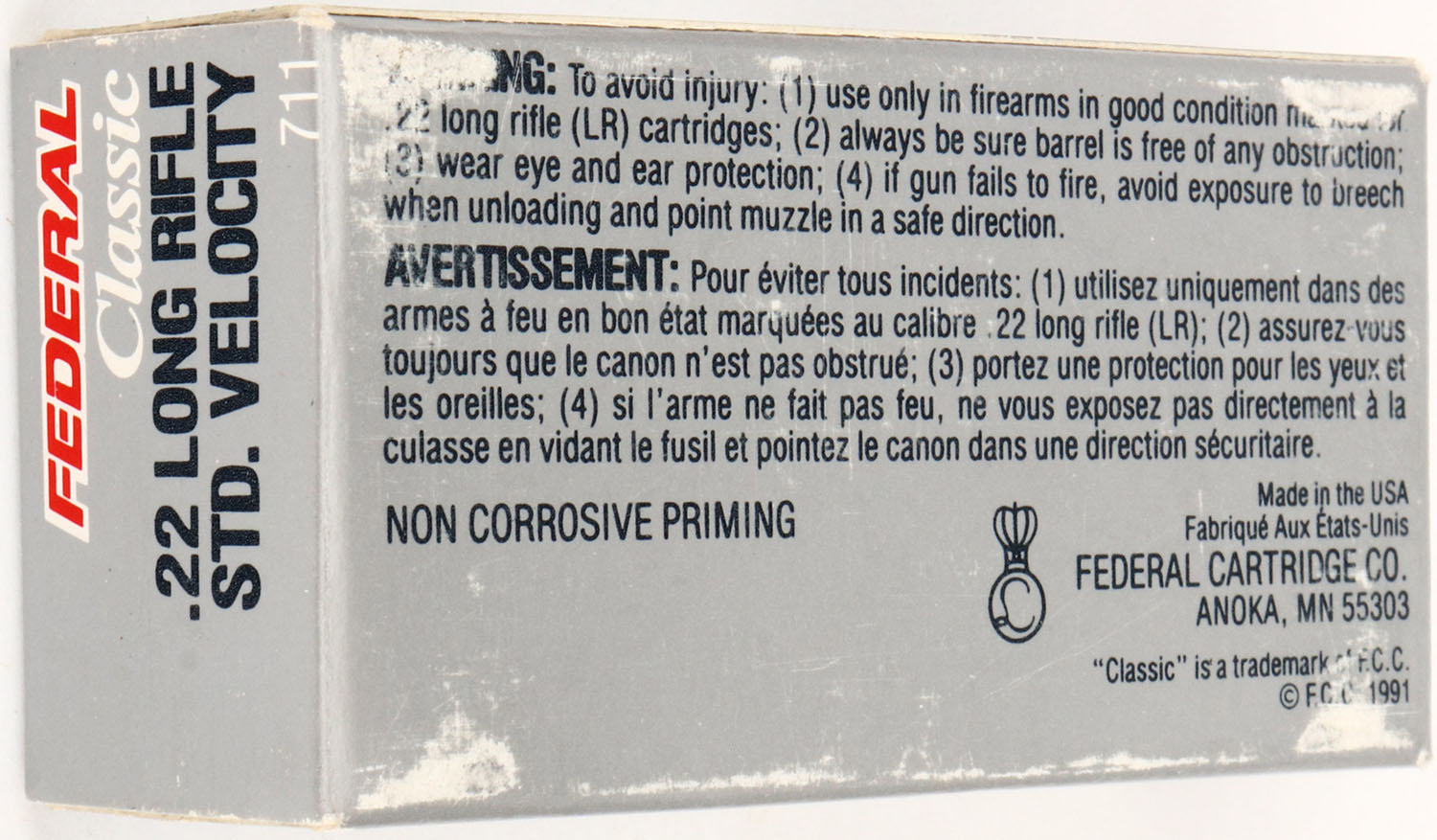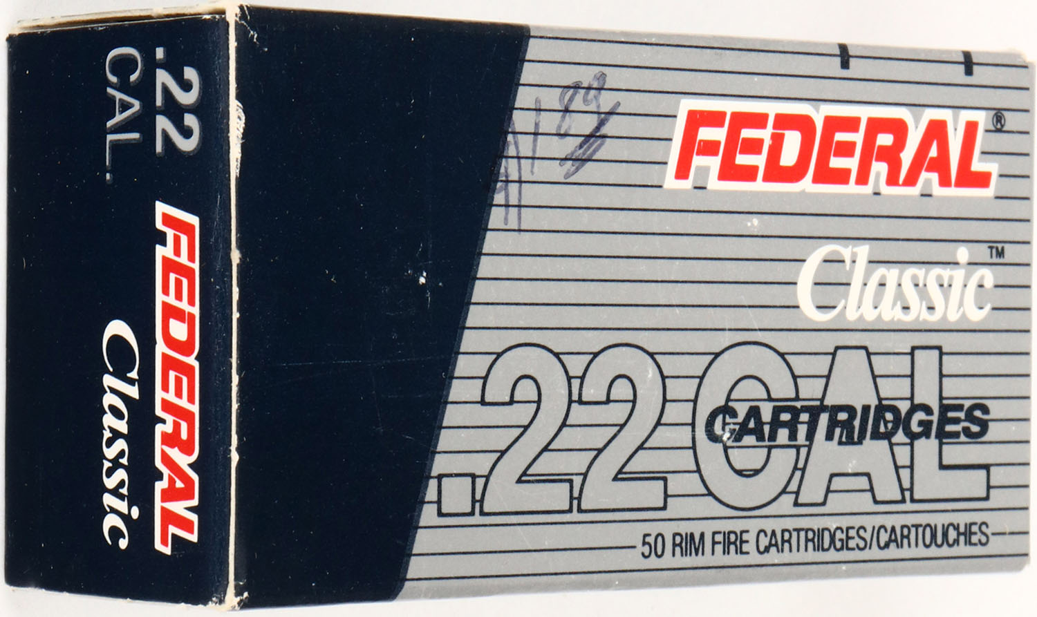 Federal, Classic, .22 Long Rifle, Standard Velocity, RHWeb: FED-21.7 LR-1, Full, 1pc. Silver & blue box, box is solid with minty color, top has been written on, very minor edge & corner wear, end flaps are solid, ammo is minty. Grade: Excellent + - Value: 2 to 20