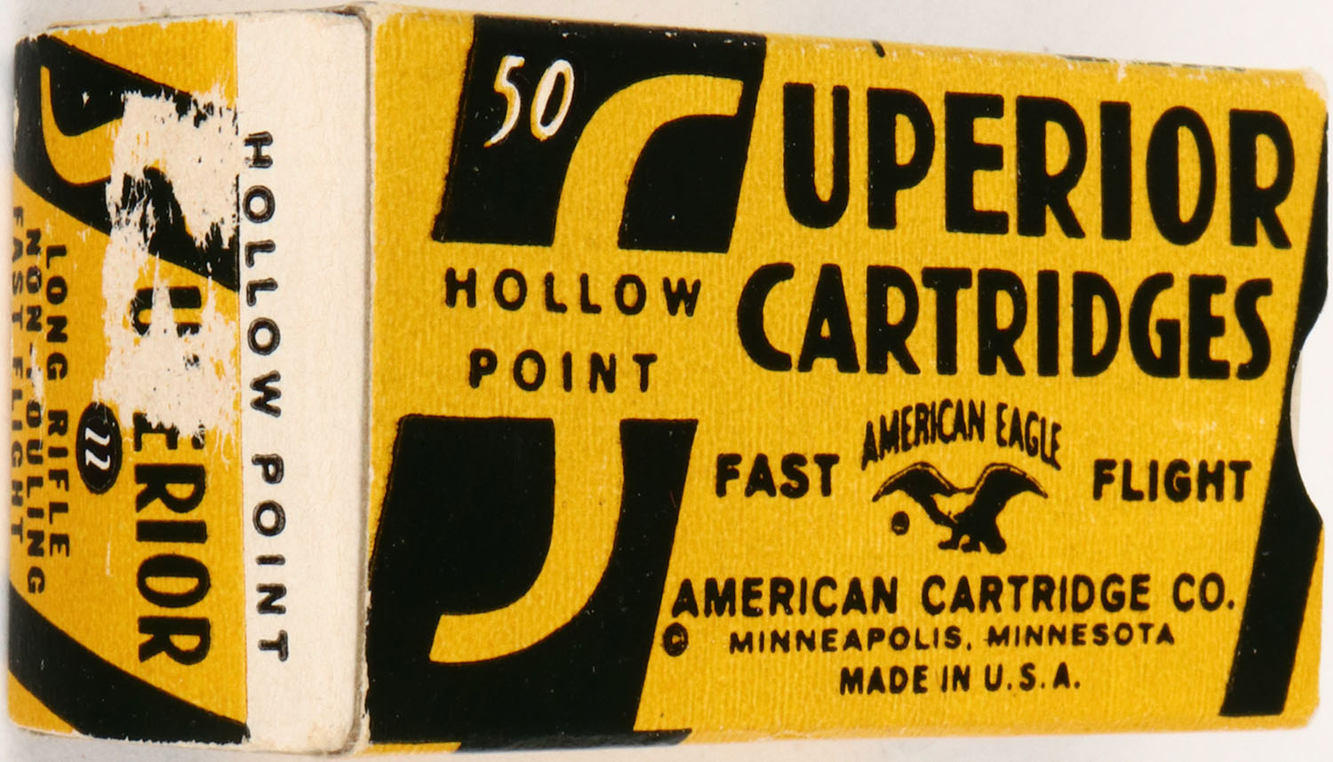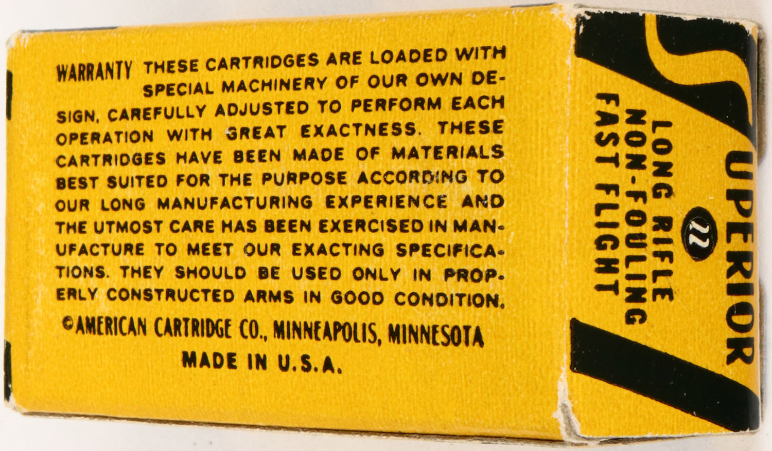 American, Superior, .22 Long Rifle Hollow Point, RHWeb: ACC-3 LR-2, Full, 1pc. Yellow & black box, box is near with minty color, corners are sharp, edges are very crisp, end flaps are very rigid, ammo is excellent. Grade: Mint - Value: 10 to 50