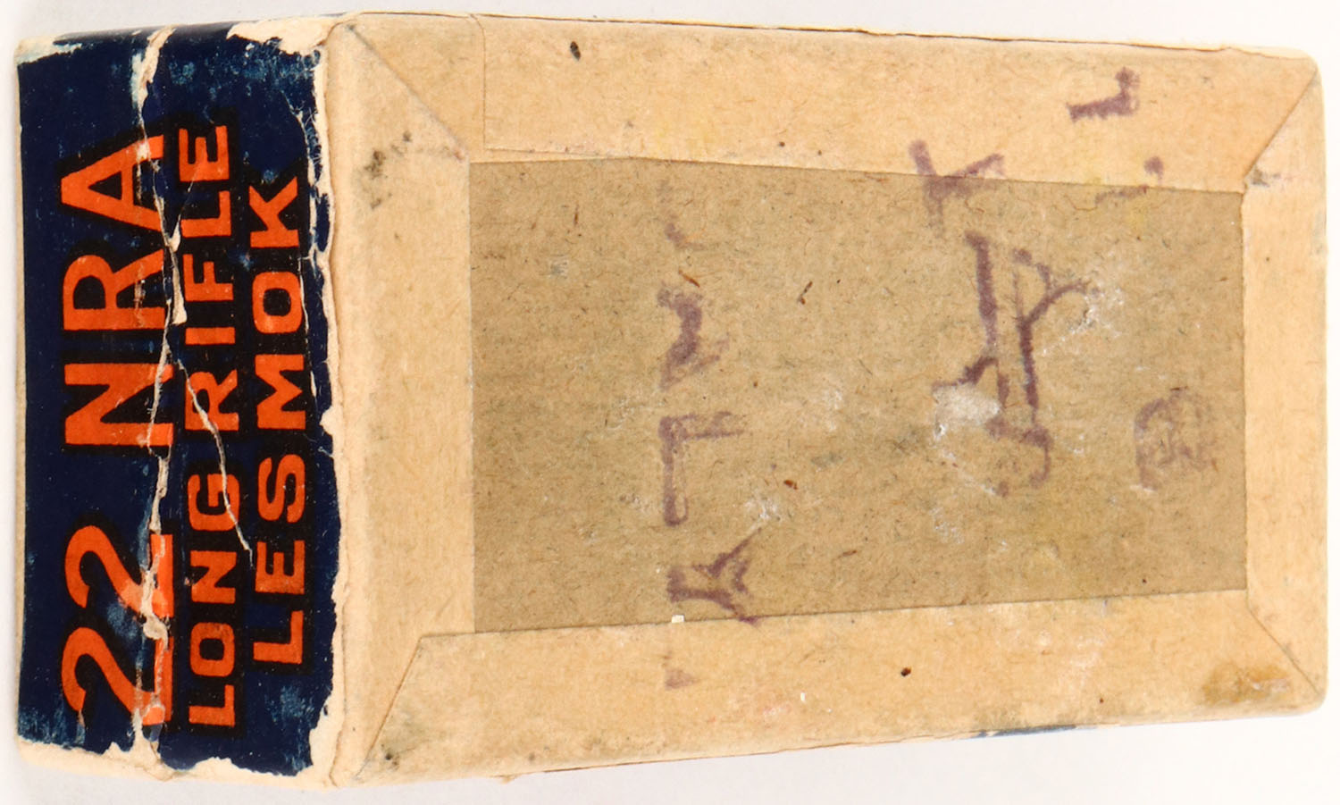 U.S., 22 NRA, .22 Long Rifle Lesmok, RHWeb: US-51 LR-5, Full & Sealed, 2pc. Buff box with blue orange & white top and wraparound labels, box is solid with excellent color, very minor edge wear, corners are mostly sharp, very minor chipping to the label. Grade: Excellent + - Value: 10 to 60