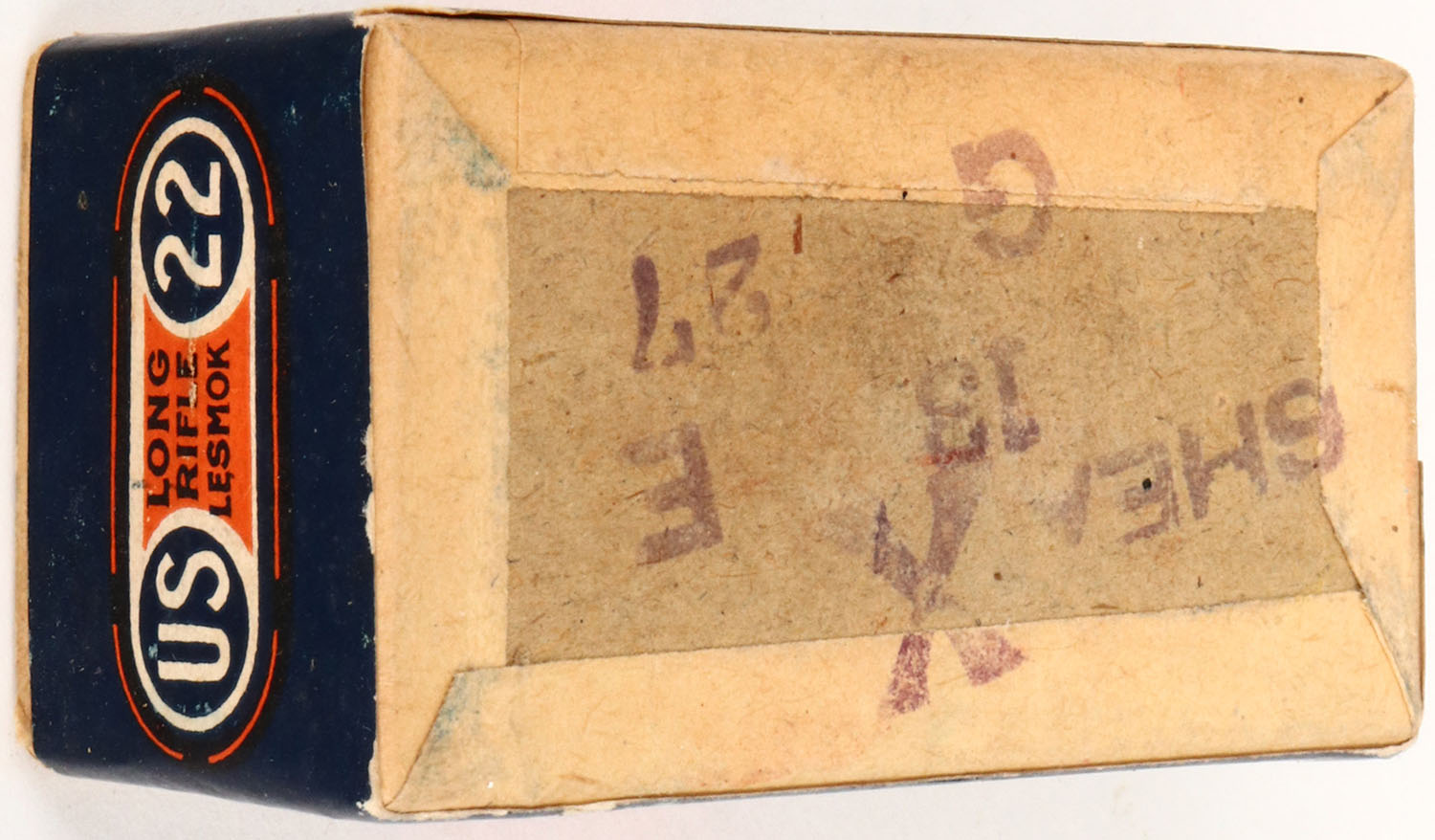 U.S., .22 Long Rifle, Target Issue, Lesmok, RHWeb: US-51 LR-1, FULL & SEALED, 2pc. Blue & orange box with red overlabel, box is solid with excellent color, minor shelf wear, edges are crisp, corners are sharp, labels are intact. Grade: Very Good ++ - Value: 10 to 100