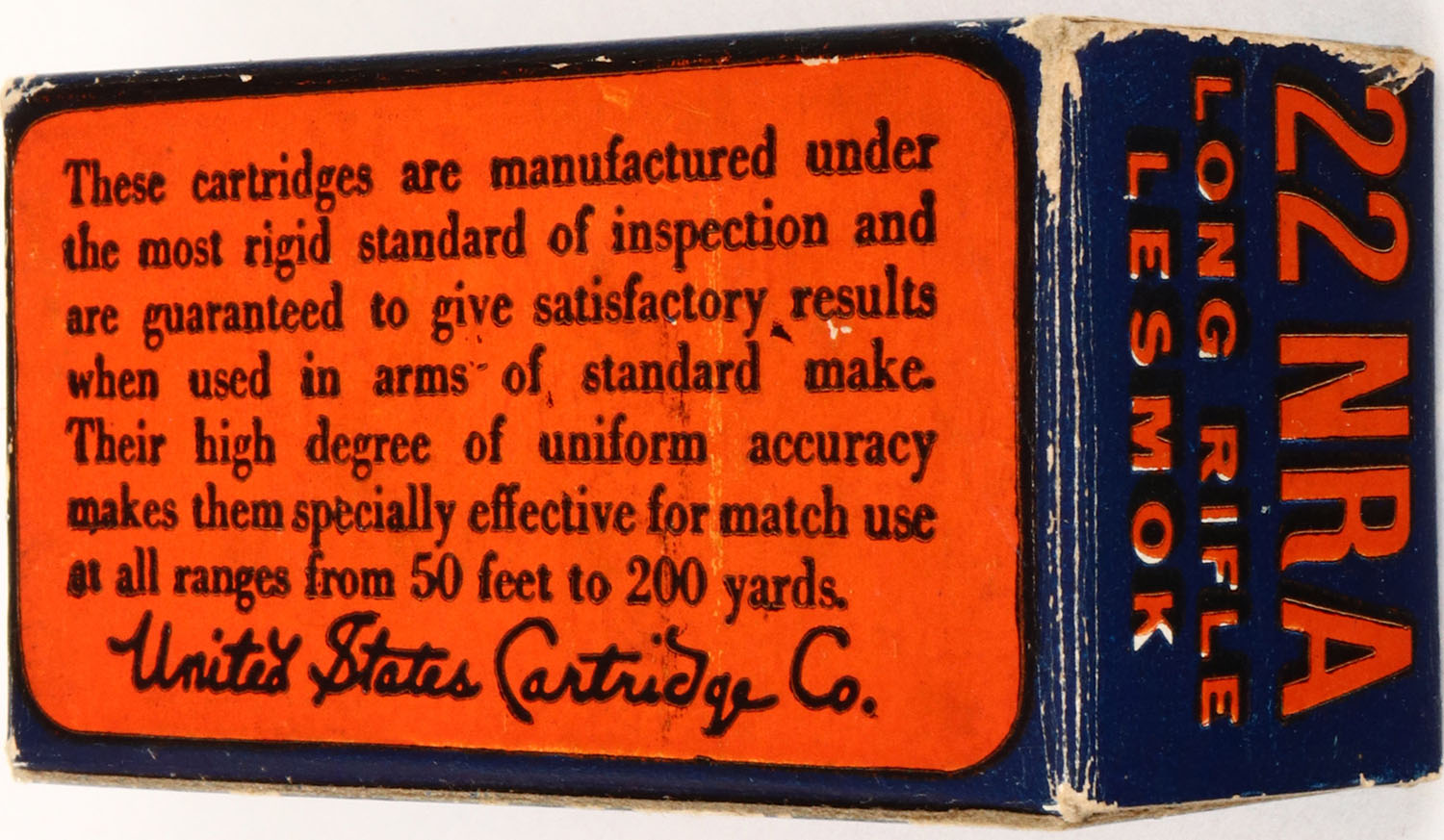 U.S., .22 Long Rifle Lesmok, 22 NRA, RHWeb: US-51 LR-9b, Full, 1pc. Blue & orange box, box is solid with excellent color, minor edge wear, edges are crisp, ammo is very good. Grade: Excellent ++ - Value: 20 to 80