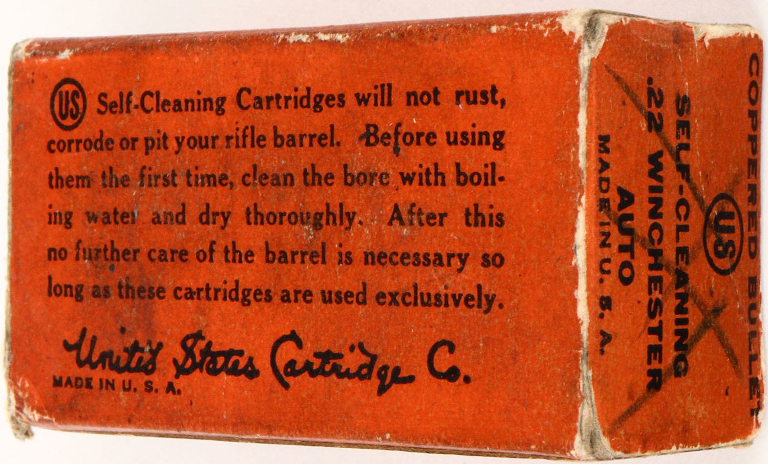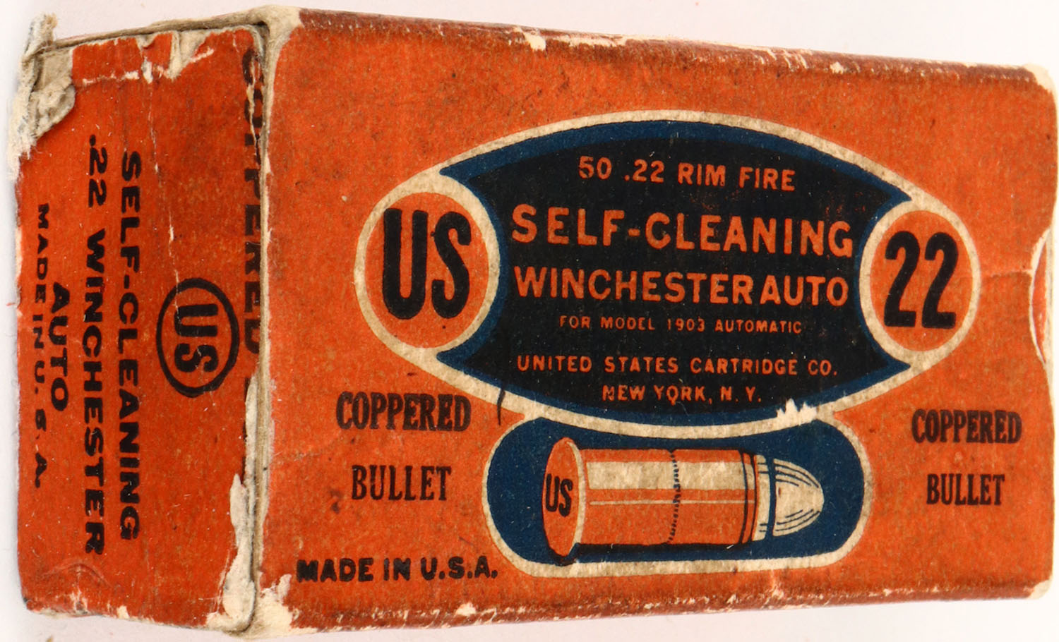 U.S., Self-Cleaning, .22 Winchester Auto, Coppered Bullet, RHWeb: US-10B WA-1, Full, 1pc. Orange & blue box, left end flap is torn, box has very good color, some age soiling, edge & corner wear, ammo is excellent. Grade: Very Good ++ - Value: 10 to 50