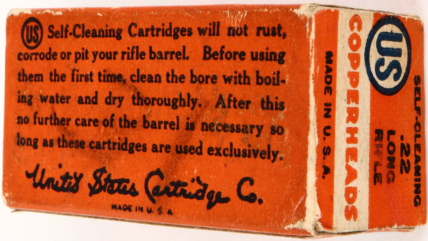 U.S., Copperheads, .22 Long Rifle, RHWeb: US-12 LR-12b, Full, 1pc. Orange white & blue box, box is solid with very good to excellent color, minor age soiling and color fading, very minor corner wear, edges are mostly crisp, end flaps are rigid, ammo is excellent. Grade: Excellent + - Value: 30 to 90