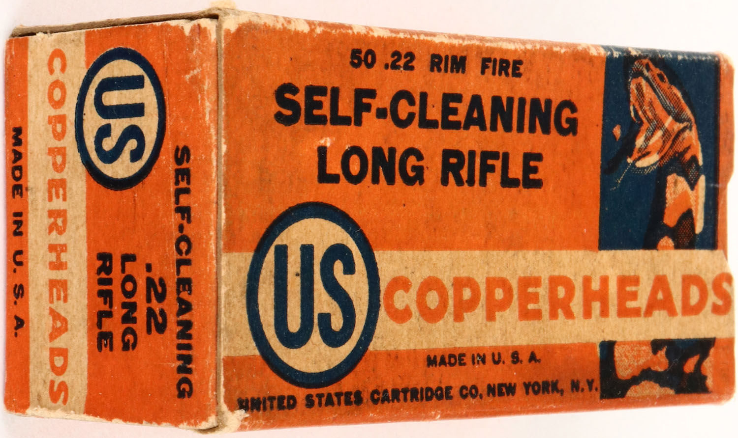 U.S., Copperheads, .22 Long Rifle, Self-Cleaning, RHWeb: US-12 LR-1b, Full, 1pc. Orange white & blue box, box is solid with excellent color, minor age soiling, very minor edge & corner wear, end flaps are solid, ammo is excellent. Grade: Excellent + - Value: 30 to 90