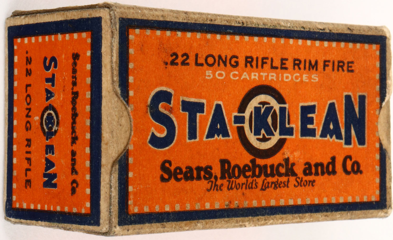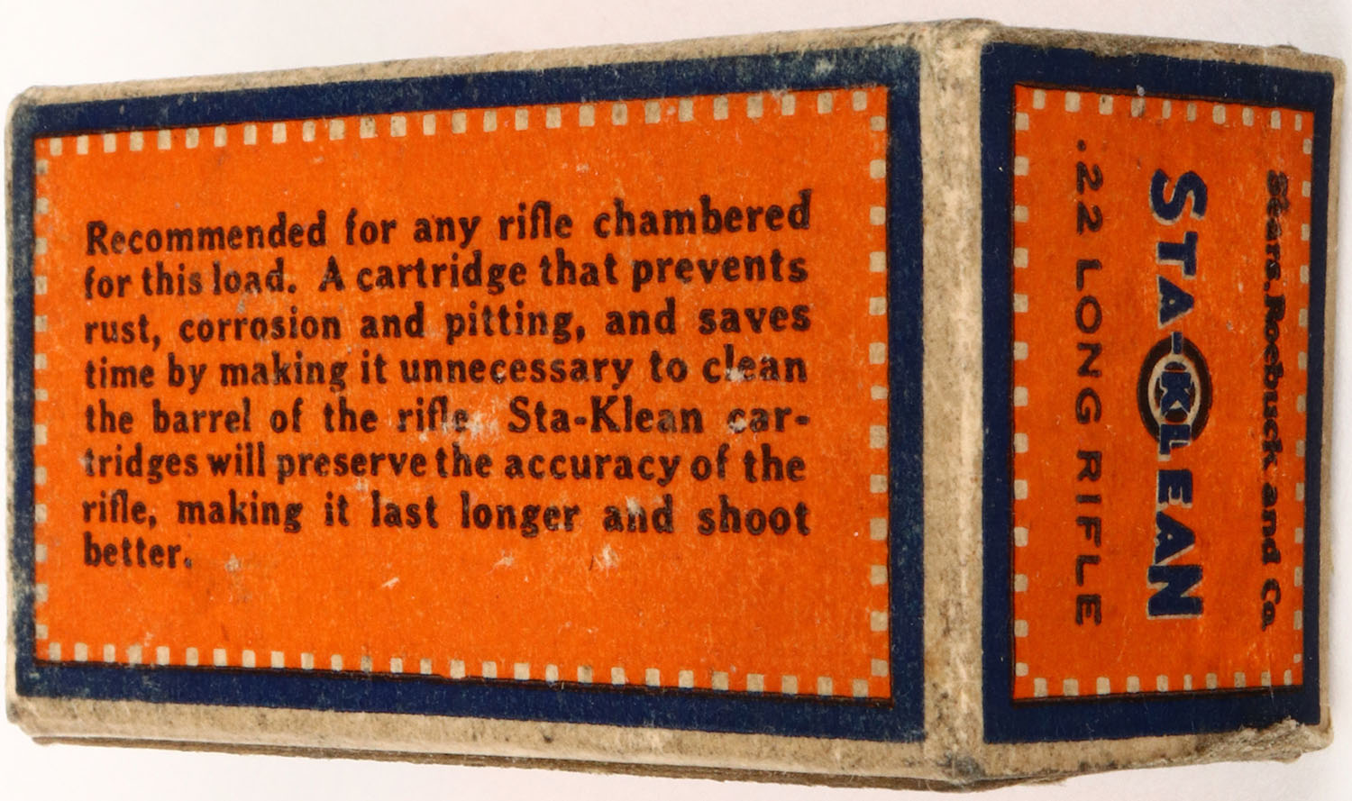 Sears, Sta-Klean, .22 Long Rifle, RHWeb: SEARS-2 LR-1, Full, 1pc. Orange blue & buff box, box is solid with excellent color, minor age soiling, very minor edge wear, corners are mostly sharp, end flaps are rigid, ammo is very good. Grade: Excellent + - Value: 30 to 90