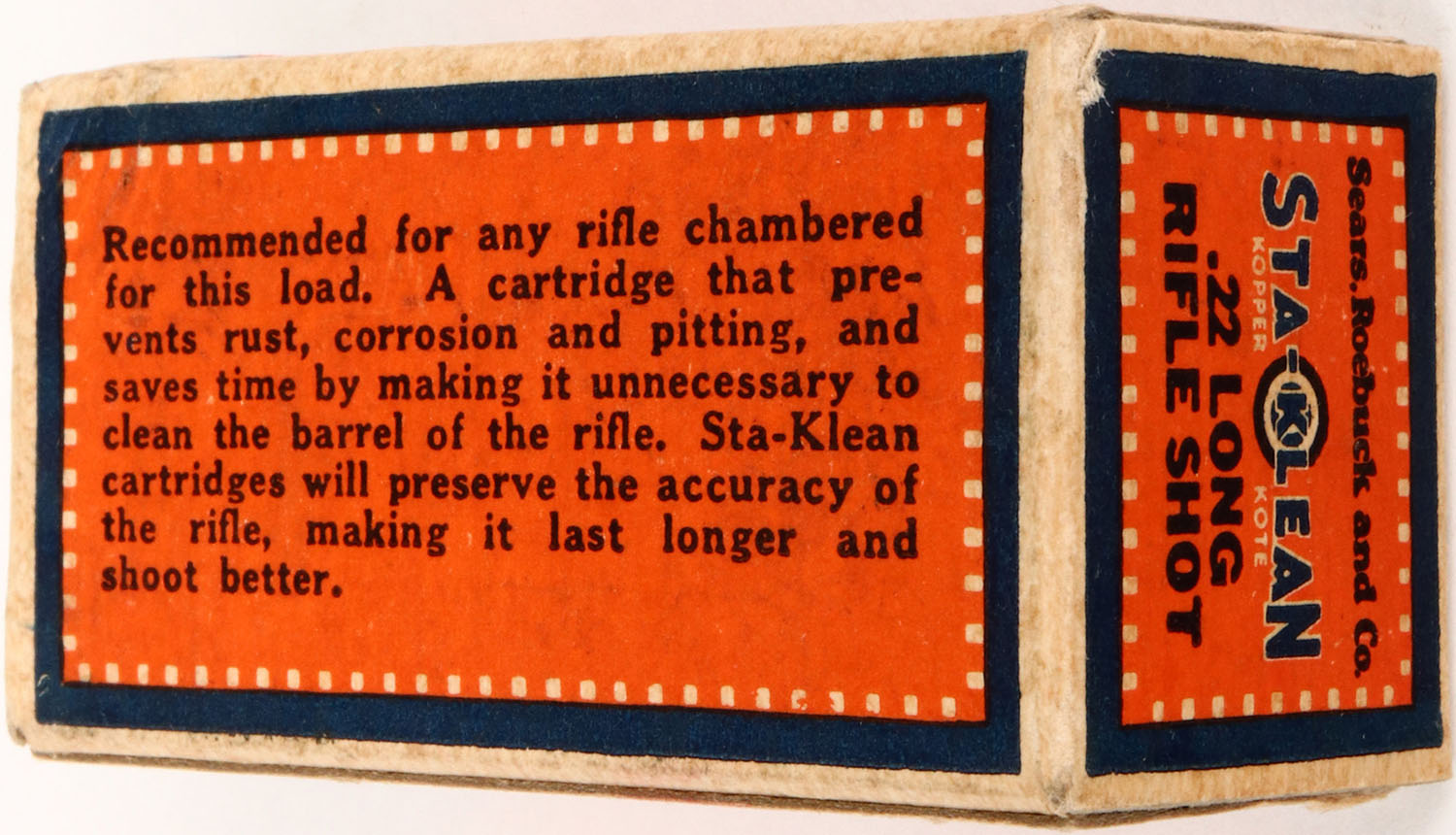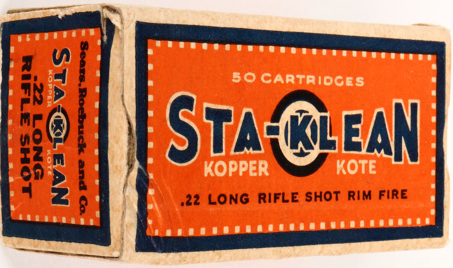 Sears, Sta-Klean, .22 Long Rifle Shot, Kopper Kote, RHWeb: SEARS-3 LR-3, Full, 1pc. Orange & blue box, box is solid with excellent color, very minor age soiling, partial seam split to left end flap tab, corner ding to top front corner, edges are crisp, corners are mostly sharp, ammo is excellent. Grade: Excellent + - Value: 30 to 90
