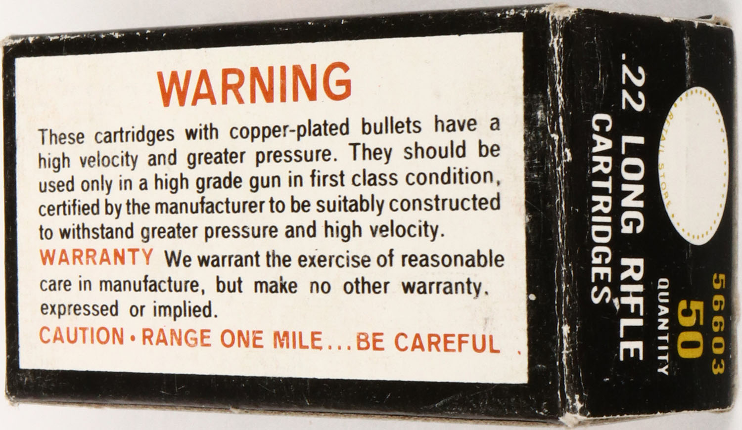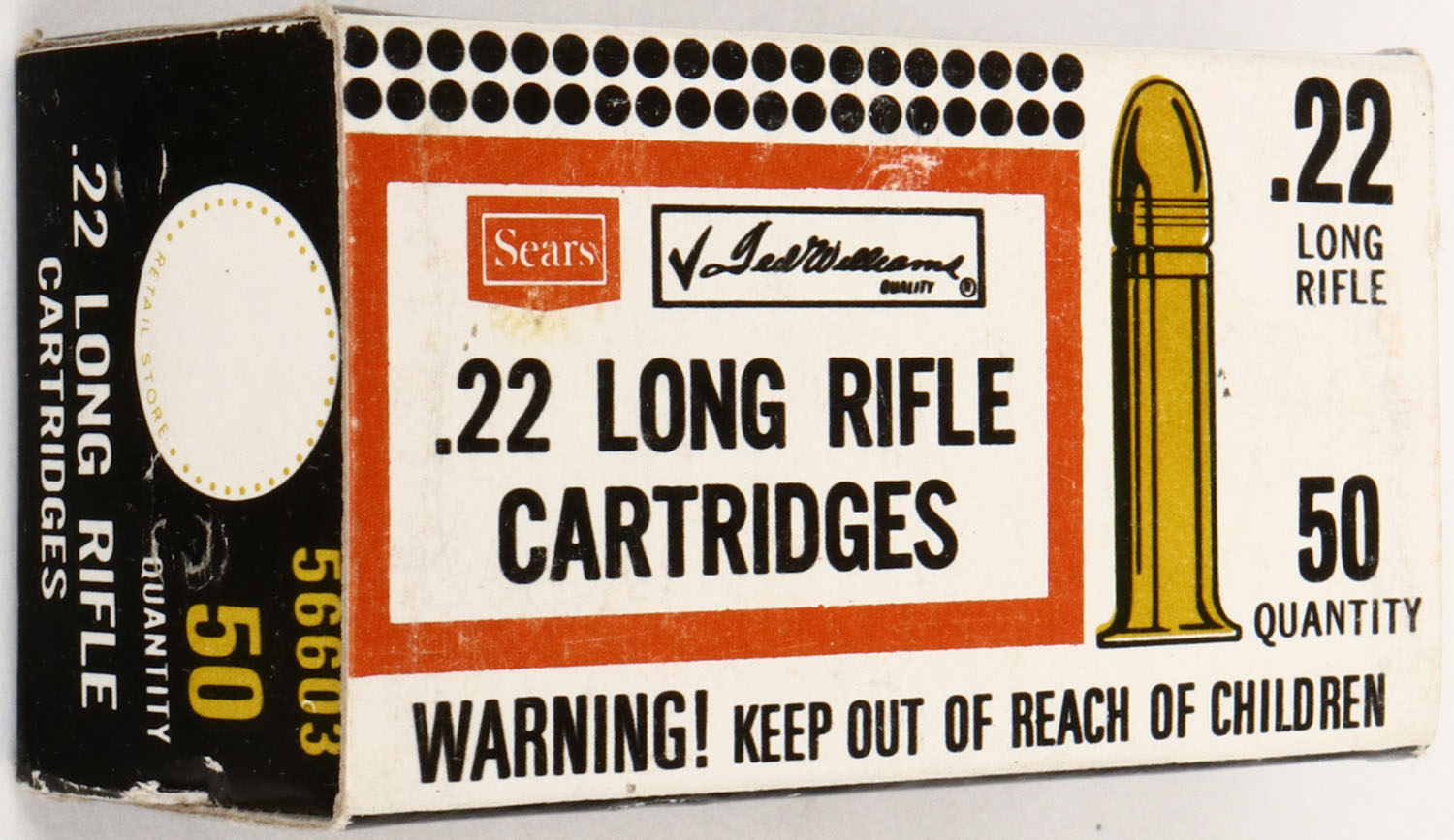 Sears, .22 Long Rifle, Copper-Plated Bullets, RHWeb: SEARS-13, LR-1, Full, 1pc. Black white & red box, box is solid with excellent color, very minor age soiling & corner wear, edges are crisp, end flaps are solid, ammo is minty. Grade: Excellent + - Value: 4 to 20