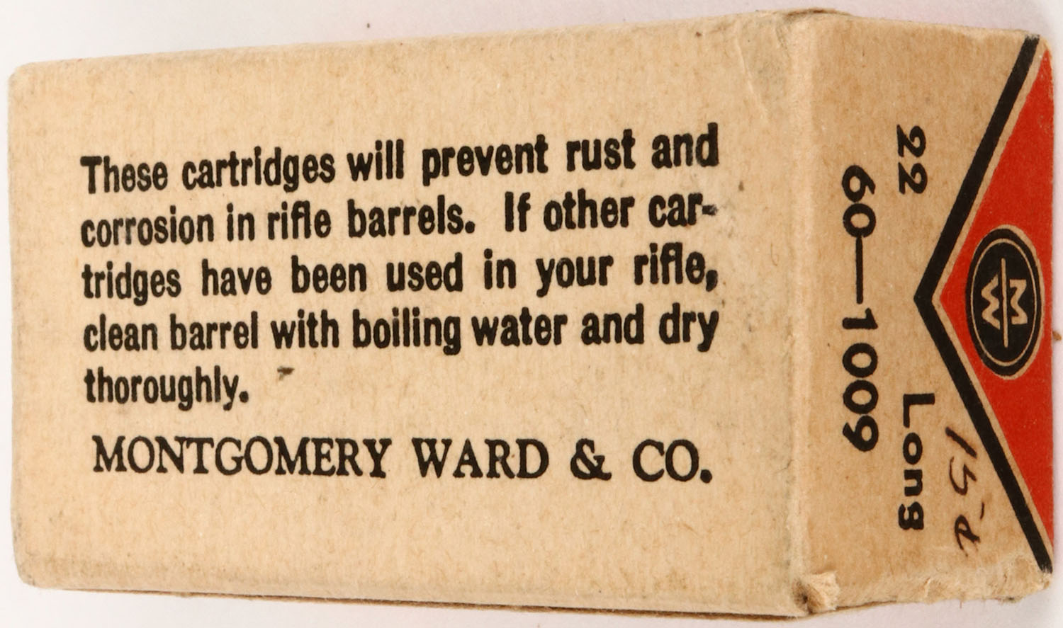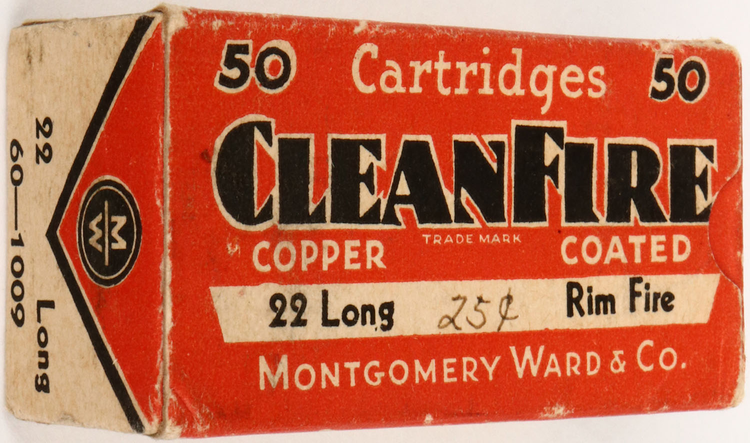 Wards, CleanFire, .22 Long, Copper Coated, RHWeb: MW-3C L-3, Full, 1pc. Red white & black box, box is solid with excellent color, some age soiling & corner wear, top and right end have been written on, very minor edge wear, end flaps are solid, ammo is excellent. Grade: Excellent + - Value: 10 to 50