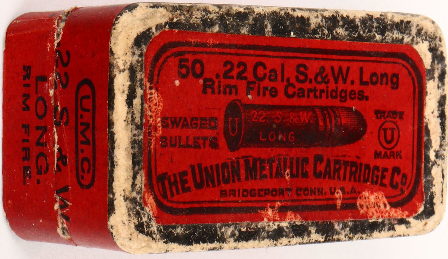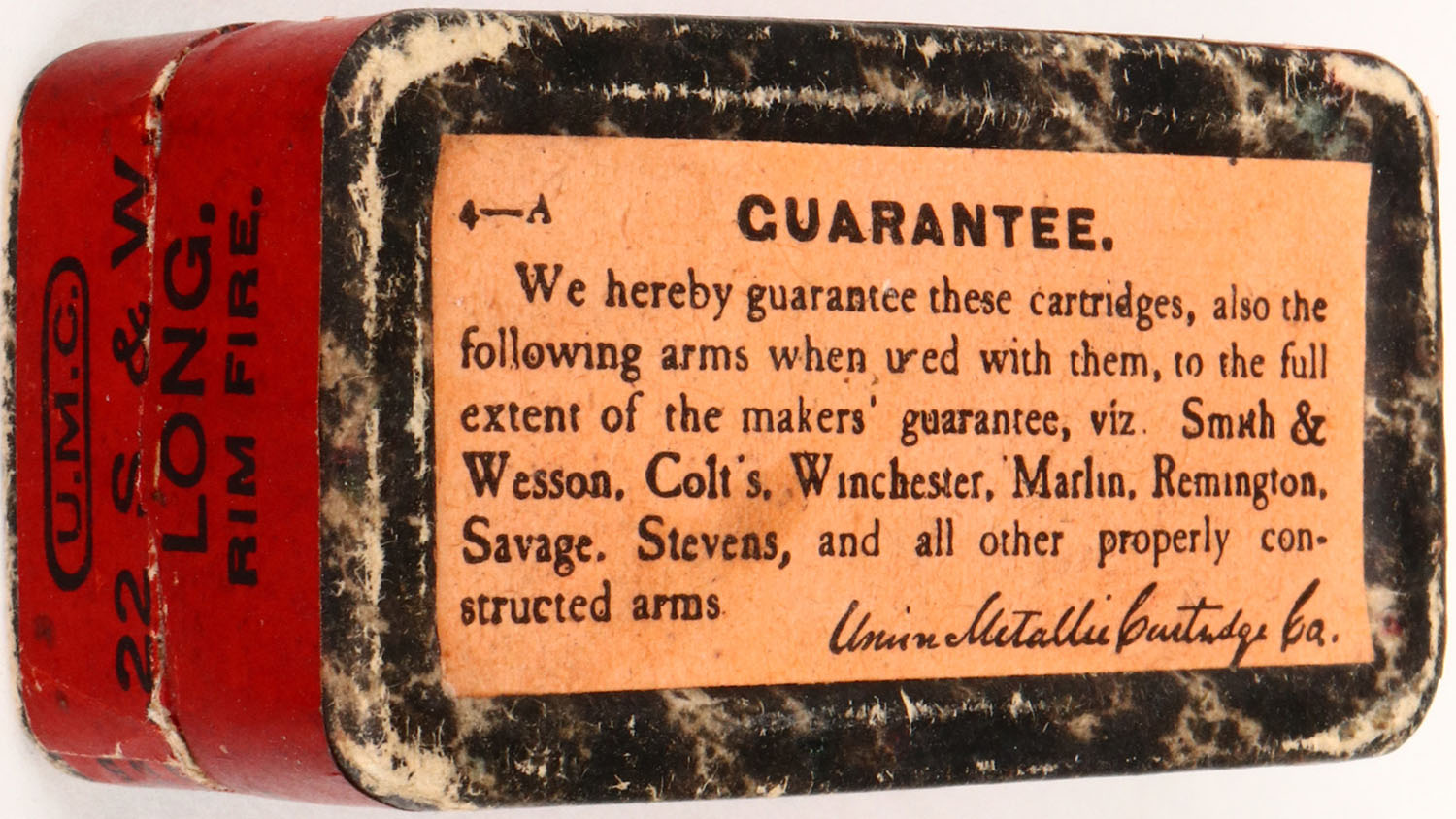 UMC, .22 Cal. S&W Long, .22 Long, Swaged Bullets, RHWeb: UMC-8 L-4, Full, 2pc. Black mottled box with red top & side sealing labels, box is solid with excellent colors, some shelf & edge wear, labels are intact, ammo is good to very good. Grade: Excellent + - Value: 30 to 150