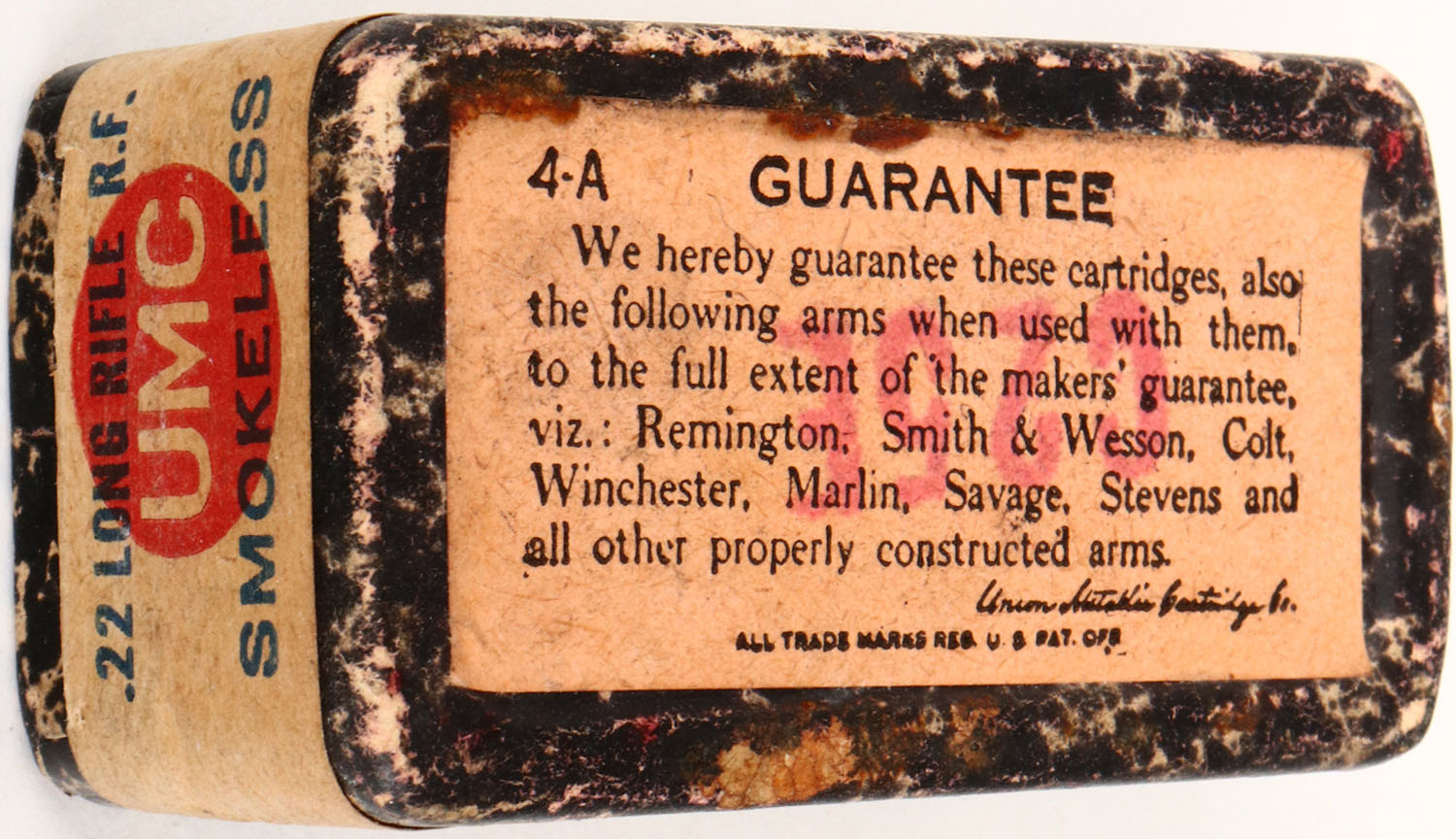UMC, .22 Long Rifle, Smokeless Cartridges, RHWeb: UMC-9 LR-3, FULL & SEALED, 2pc. Black mottled box with buff top & side sealing labels, box is near mint with minty color, very minor shelf wear on bottom, edges are crisp, labels are intact. Grade: Excellent ++ - Value: 50 to 150