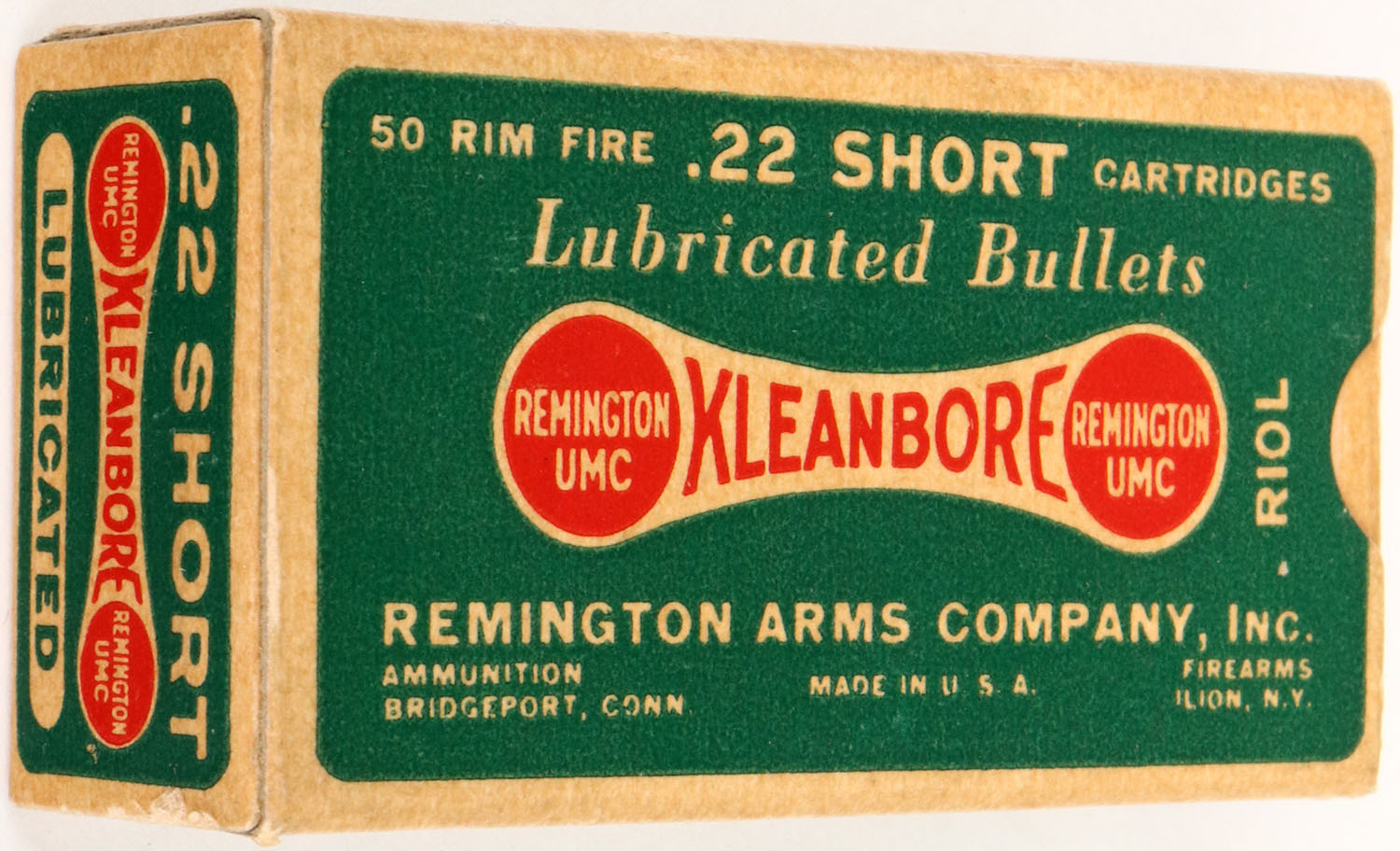 Remington, Kleanbore, .22 Short, RHWeb: REM-7.2 S-1b, Full, 1pc. Green & white dog bone box, box is near mint with excellent to minty color, only very minor age soiling, corners are sharp, edges are crisp, end flaps are rigid, ammo is excellent. Grade: Excellent ++ - Value: 10 to 50