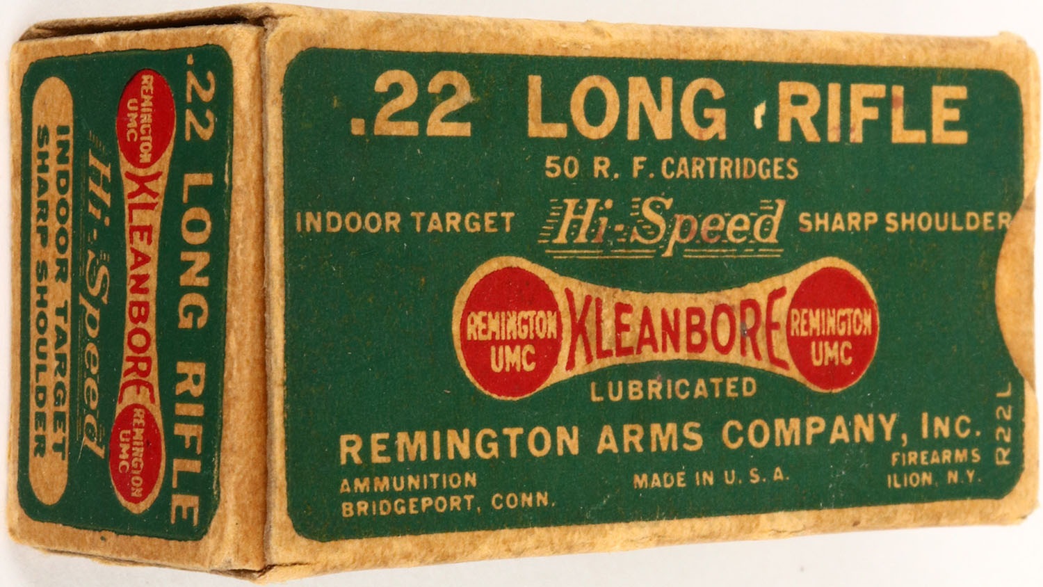 Remington, Kleanbore, .22 Long Rifle, Indoor Target, RHWeb: REM-69 LR-1b, Full, 1pc. Green & buff dogbone box, box is solid with excellent color, very minor age soiling, minor corner wear, edges are mostly crisp, end flaps are rigid, ammo is excellent. Grade: Excellent ++ - Value: 20 to 80