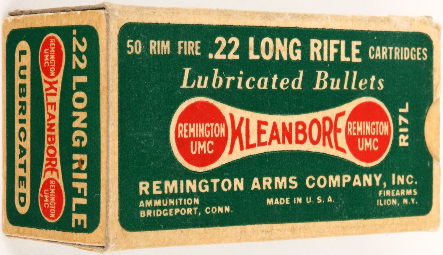 Remington, Kleanbore, .22 Long Rifle, RHWeb: REM-7.2 LR-1e, Full, 1pc. Green & buff dog bone box, box is solid with excellent color, very minor age soiling & corner wear, edges are crisp, end flaps are solid, ammo is excellent. Grade: Excellent ++ - Value: 8 to 40