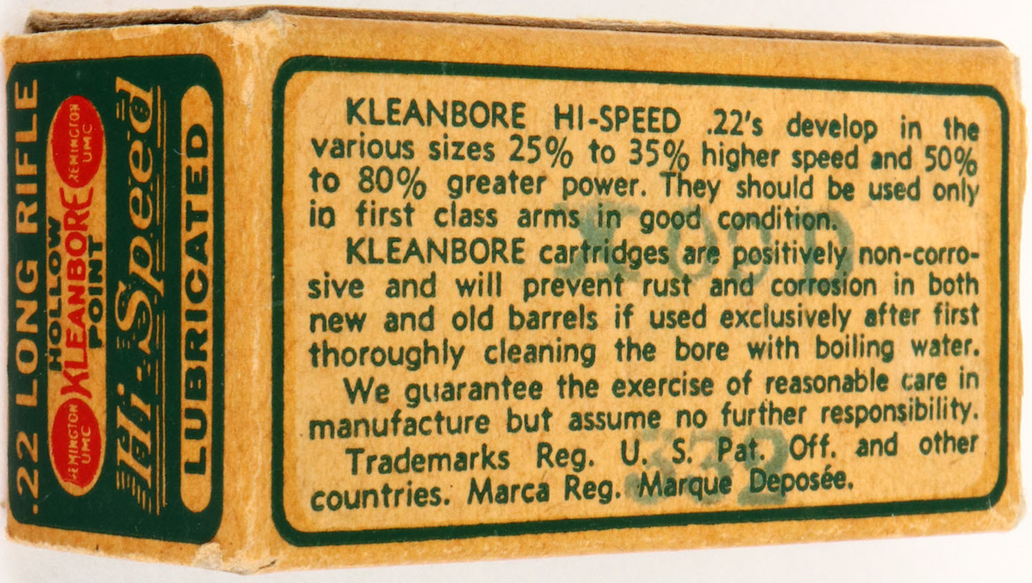 Remington, Kleanbore, .22 Long Rifle Hollow Point, Hi-Speed, RHWeb: REM-7.4 LR-3e, Full, 1pc. Green & buff dogbone box, box is solid with excellent color, very minor edge wear on end flaps, very minor corner wear, edges are mostly crisp, end flaps are rigid, ammo is excellent. Grade: Excellent ++ - Value: 10 to 50