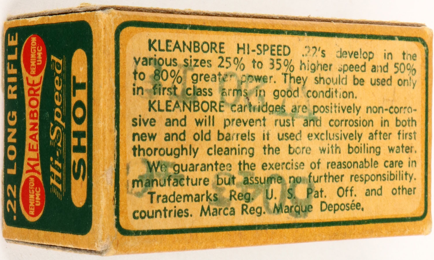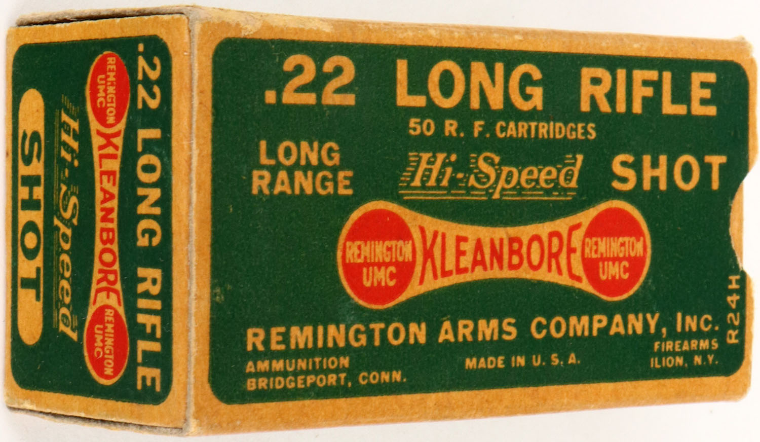 Remington, Kleanbore Hi-Speed, .22 Long Rifle Shot, RHWeb: REM-7.4 LR-4c, Full, 1pc. Green & buff box, box is solid with excellent color, some age soiling, very minor corner wear, edges are crisp, end flaps are solid, ammo is excellent. Grade: Excellent ++ - Value: 10 to 50