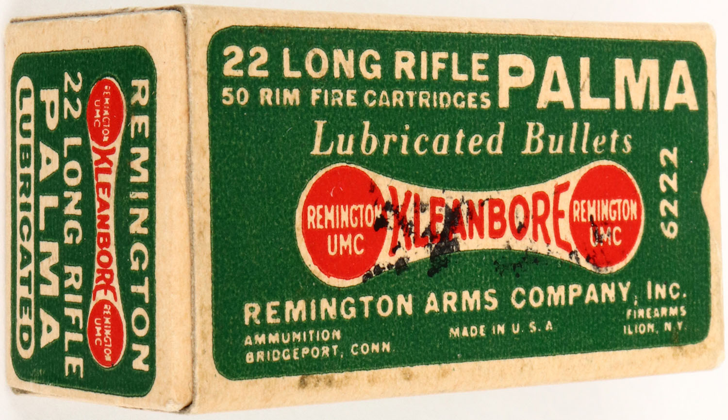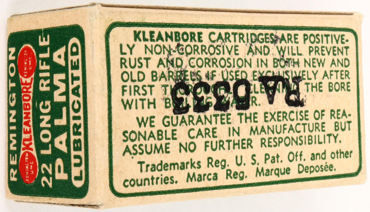 Remington, Palma, .22 Long Rifle, Lubricated Bullets, RHWeb: REM-52 LR-13a (diamond thumb cut), Full, 1pc. Green dogbone box, box is near mint with minty color, sharp crisp corners & edges, has ink stain on top, ammo is excellent. Grade: Excellent ++ - Value: 10 to 60