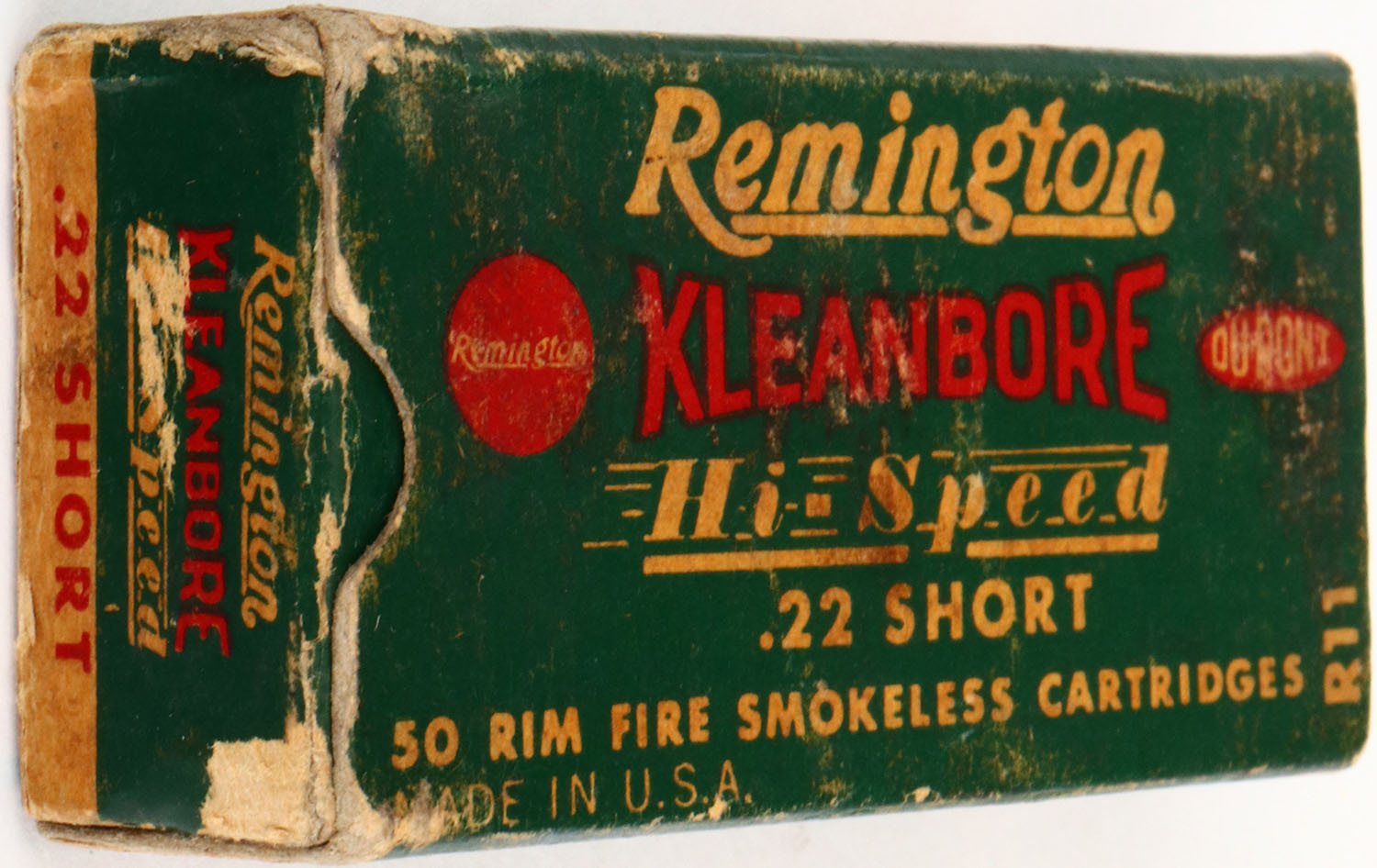 Remington, .22 Short, Kleanbore Hi-Speed, Non-Corrosive Non-Erosive, RHWeb: REM-10 S-1b, Full, 1pc. Green white & red box, box is solid with good color, some age soiling & edge wear, minor scuffing throughout, ammo is very good. Grade: Excellent - Value: 6 to 30