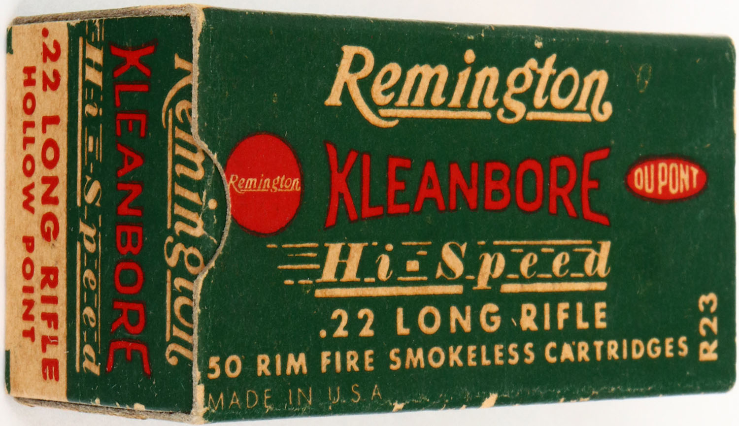 Remington, Kleanbore, .22 Long Rifle, Hi-Speed, RHWeb: REM-10 LR-2a, Full, 1pc. Green white & red box, box is solid with excellent color, very minor corner & edge wear, end flaps are rigid, ammo is excellent. Grade: Excellent ++ - Value: 6 to 30