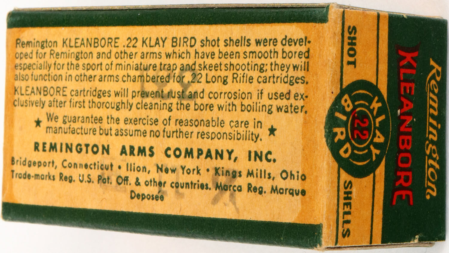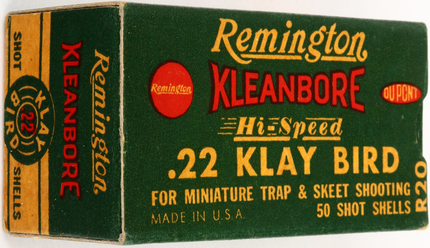 Remington, .22 Klay Bird, Kleanbore Hi-Speed, Non-Corrosive, RHWeb: REM-10 LR-3b, Partial 49rds., 1pc. Green white & red box, box is near mint, only very minor age soiling, excellent color, edges and corners are crisp & sharp, ammo is excellent. Grade: Excellent ++ - Value: 20 to 60