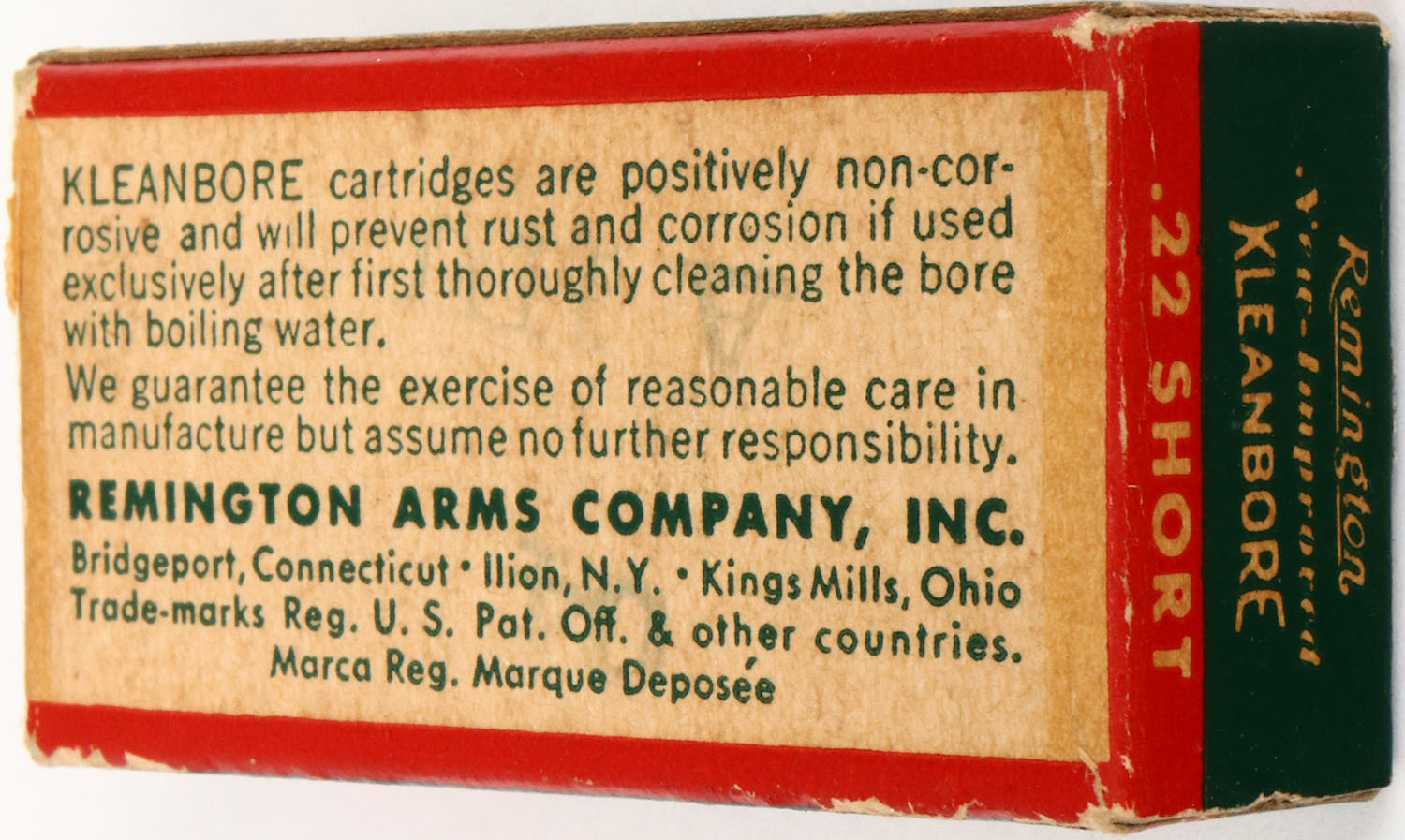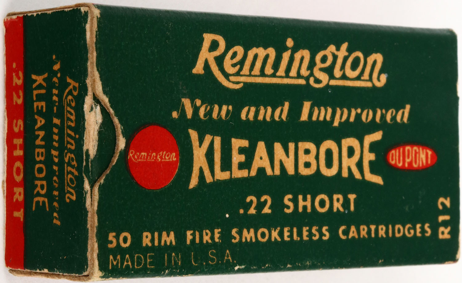 Remington, New and Improved Kleanbore, .22 Short, RHWeb: REM-11 S-1, Full, 1pc. Green white & red box, box is solid with excellent color, very minor age soiling, minor corner wear, edges are mostly crisp, end flaps are rigid, ammo is excellent. Grade: Excellent ++ - Value: 6 to 30