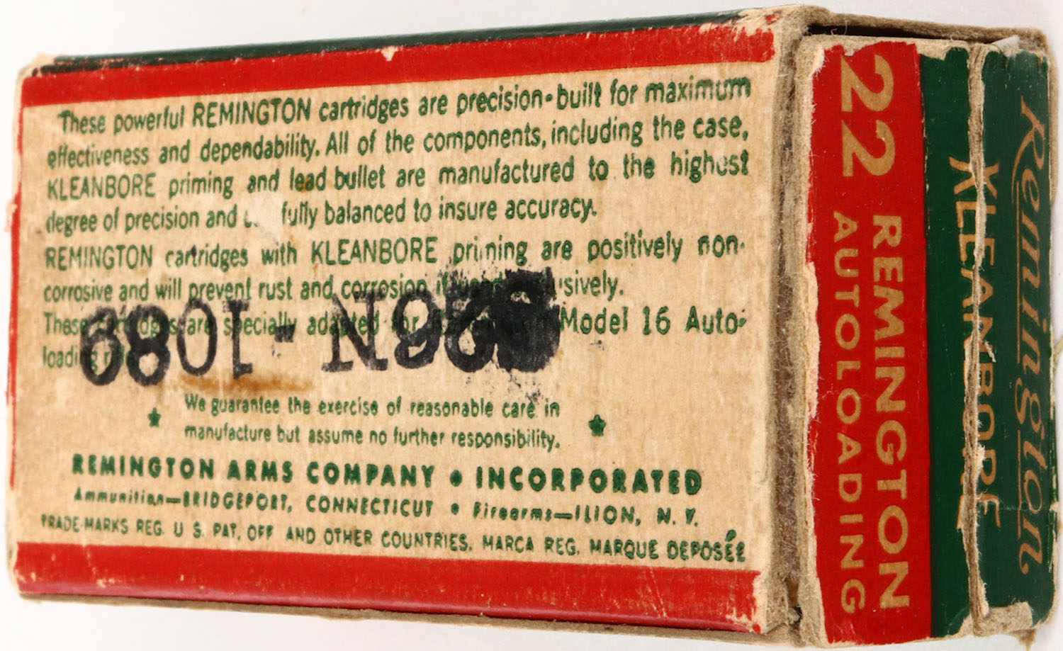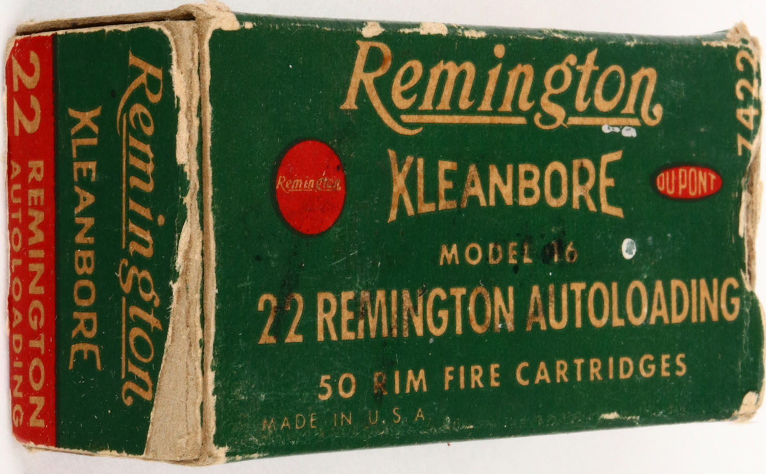 Remington, Kleanbore, .22 Remington Autoloading, RHWeb: REM-12 RA-1b, Full, 1pc. Green white & red box, box has excellent color, right end flap has been torn & taped back on, minor age soiling, minor edge & corner wear, end flaps are not rigid, ammo is excellent. Grade: Very Good ++ - Value: 50 to 100