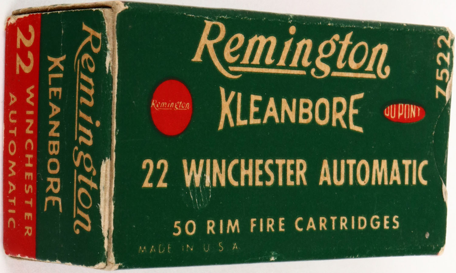 Remington, Kleanbore, .22 Winchester Automatic, 7522, RHWeb: REM-12 WA-1a, Full, 1pc. Green red & white box, box is solid with excellent color, very minor age soiling, some edge & corner wear, end flaps are solid, ammo is excellent to minty. Grade: Excellent ++ - Value: 10 to 50