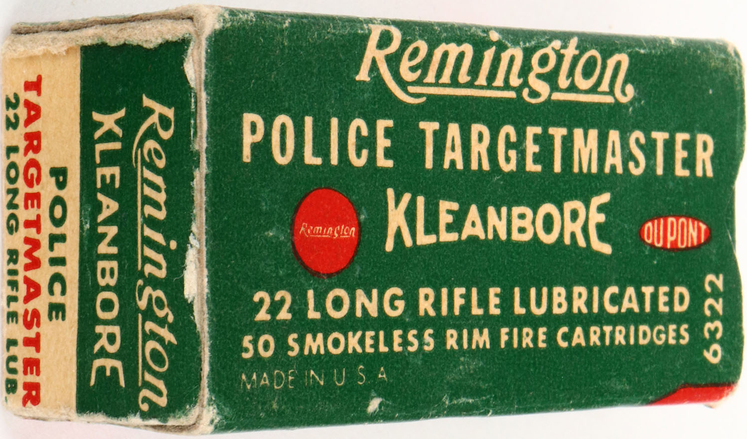 Remington, Police Targetmaster, .22 Long Rifle, Kleanbore, RHWeb: REM-69 LR-2d, Full, 1pc. Green white & red box, box is solid with excellent color, minor corner wear, edges are mostly crisp, end flaps are rigid, ammo is excellent. Grade: Excellent + - Value: 10 to 50