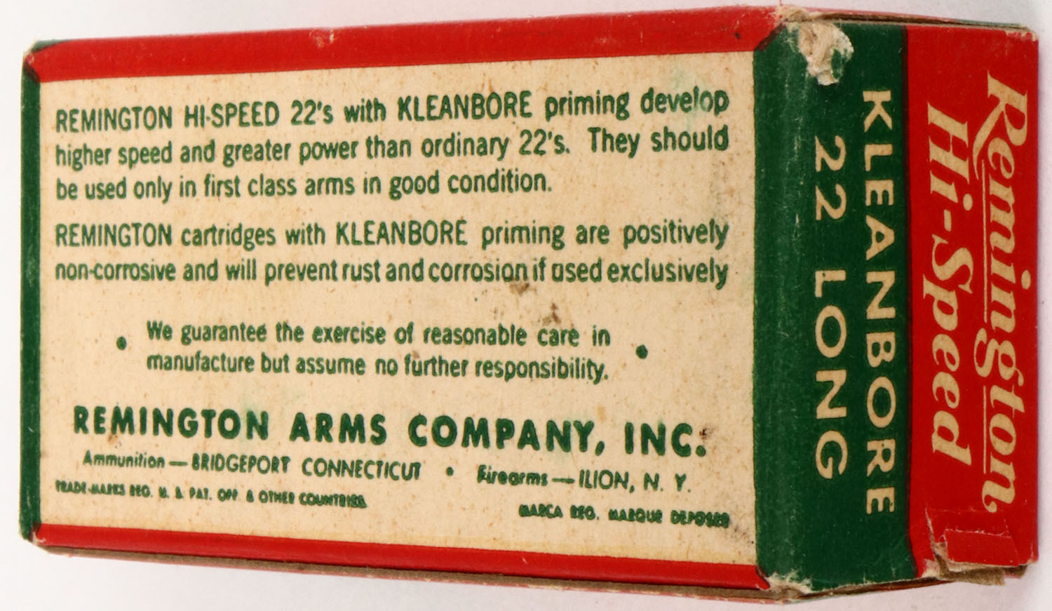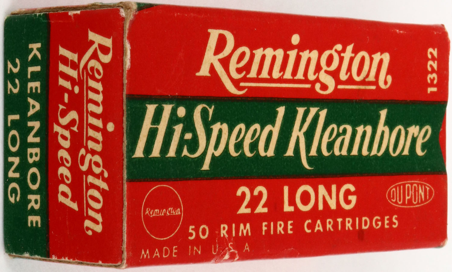 Remington, Hi-Speed Kleanbore, .22 Long, RHWeb: REM-14 L-1b, Full, 1pc. Red white & green box, box is solid with excellent color, very minor edge & corner wear, end flaps are rigid, ammo is excellent. Grade: Excellent++ - Value: 4 to 20