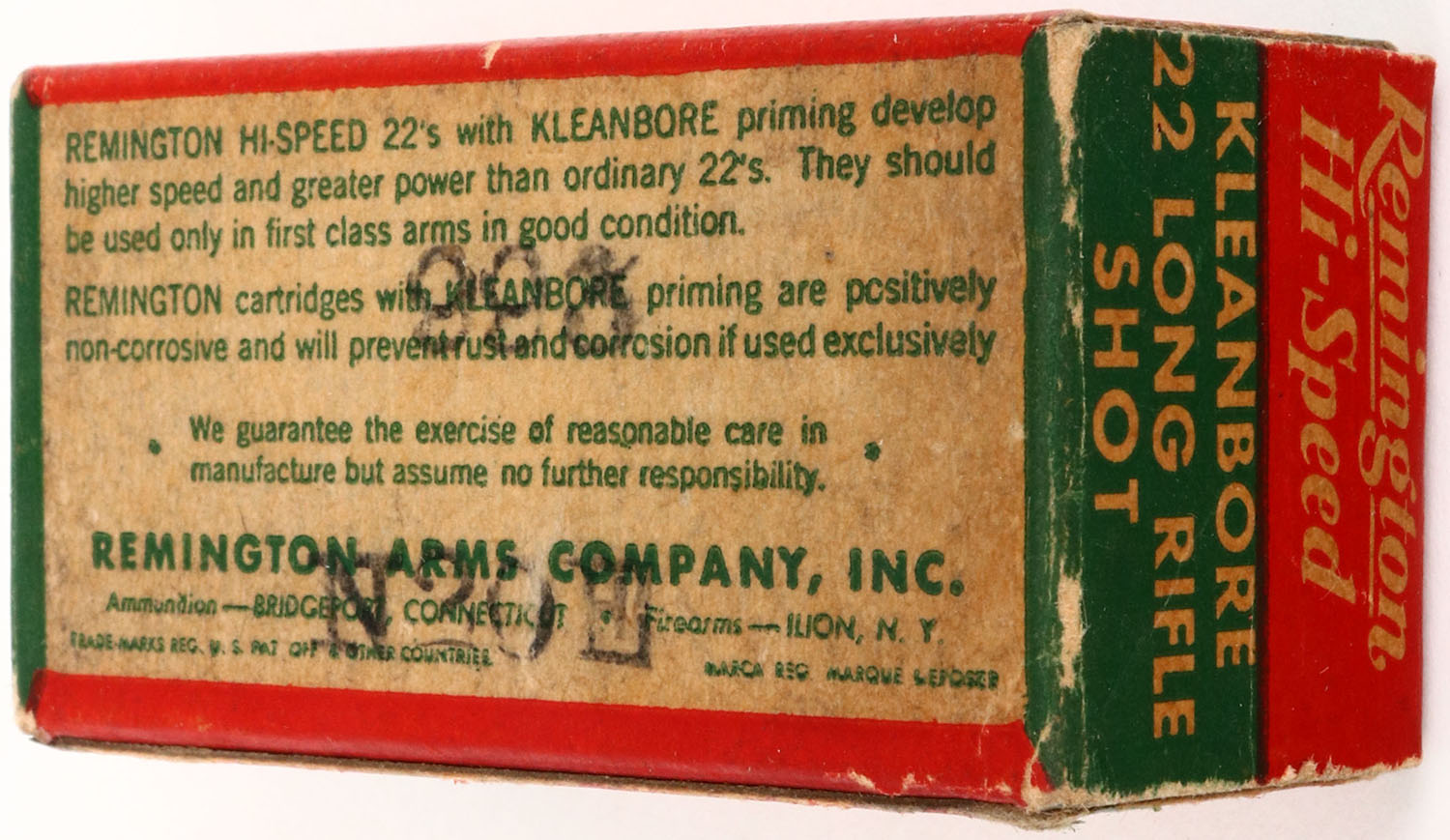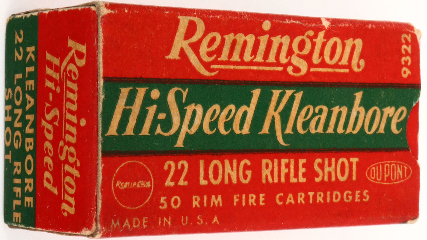 Remington, Hi-Speed Kleanbore, .22 Long Rifle Shot, RHWeb: REM-14 LR-5a, Full, 1pc. Red white & green box, box is solid with excellent color, some age soiling, very minor corner wear, edges are crisp, end flaps are rigid, ammo is minty. Grade: Excellent ++ - Value: 10 to 50