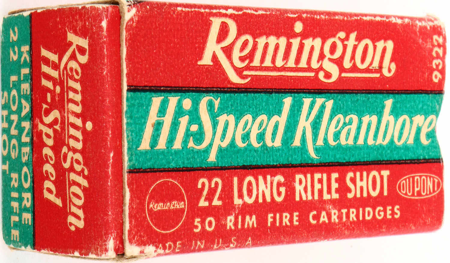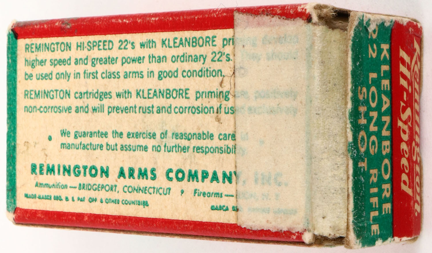 Remington, Hi-Speed Kleanbore, .22 Long Rifle Shot, RHWeb: REM-14 LR-5c, Full, 1pc. Red white & green box, box has excellent color, right end flap has been torn & taped, some corner wear, edges are mostly crisp, left end flap is rigid, ammo is excellent. Grade: Very Good ++ - Value: 6 to 30