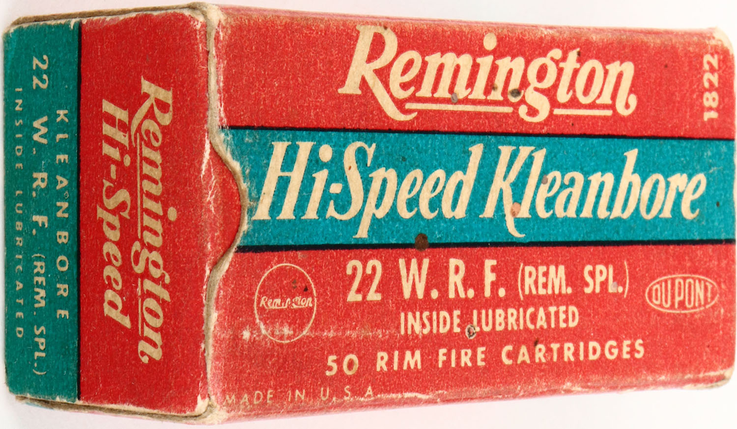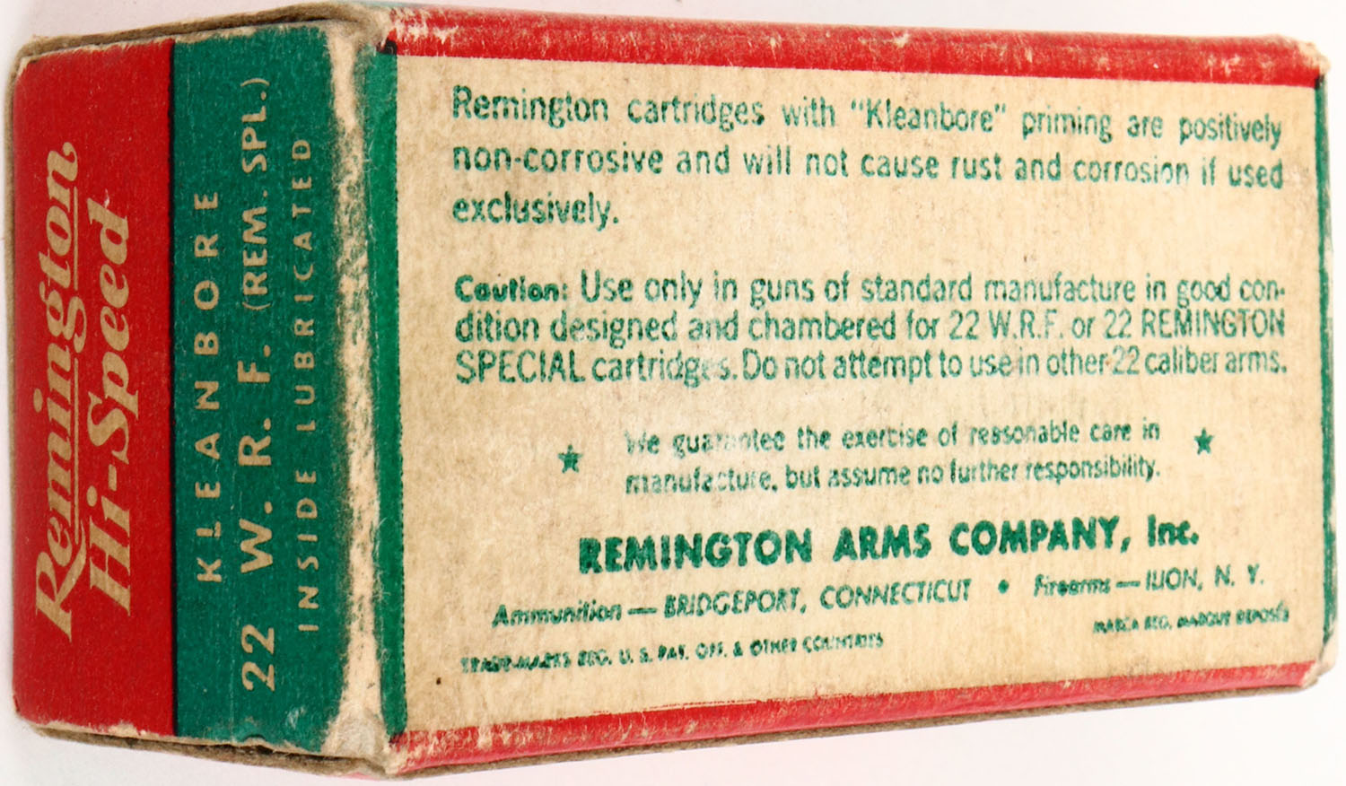 Remington, .22 W.R.F. (Rem. Spl.), Hi-Speed, Inside Lubricated, Non-Corrosive Kleanbore Priming, RHWeb: REM-14 WRF-1.5a, Full, 1pc. Red green & white box, box is solid with good color, some fading & age soiling, minor edge wear, ammo is excellent. Grade: Excellent - Value: 10 to 50