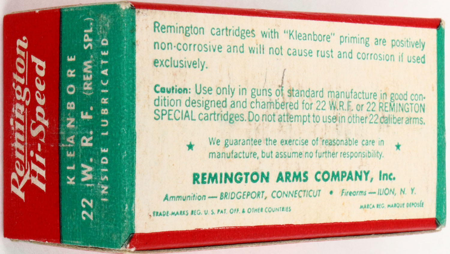 Remington, .22 W.R.F. (Rem. Spl.), Hi-Speed, Inside Lubricated, Non-Corrosive Kleanbore Priming, RHWeb: REM-14 WRF-1.5c, Full, 1pc. Red green & white box, box is solid with excellent color, very minor edge wear on ends, edges are crisp, ammo is minty. Grade: Excellent ++ - Value: 10 to 50