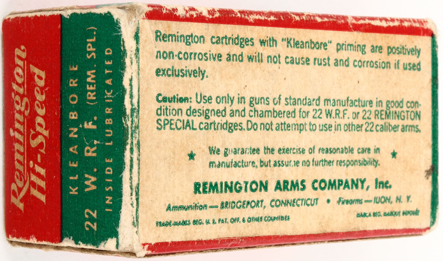 Remington, Hi-Speed Kleanbore, .22 W.R.F. (Rem. Spl.), RHWeb: REM-14 WRF-1c, Full, 1pc. Red green & white box, box is solid with very good color, some age soiling, edge & corner wear, end flaps are solid, ammo is excellent. Grade: Excellent - Value: 8 to 40