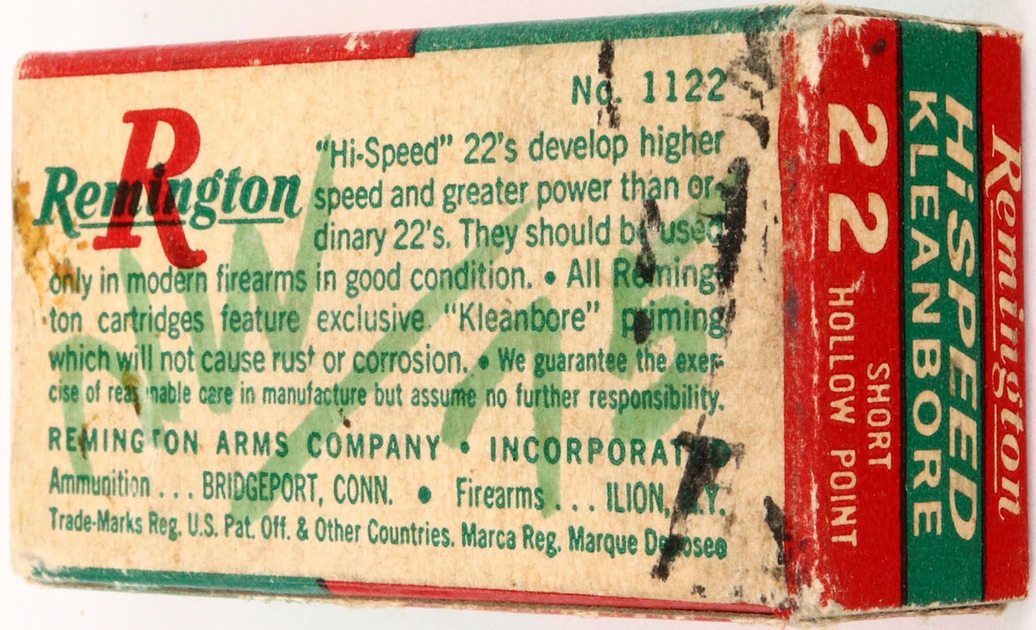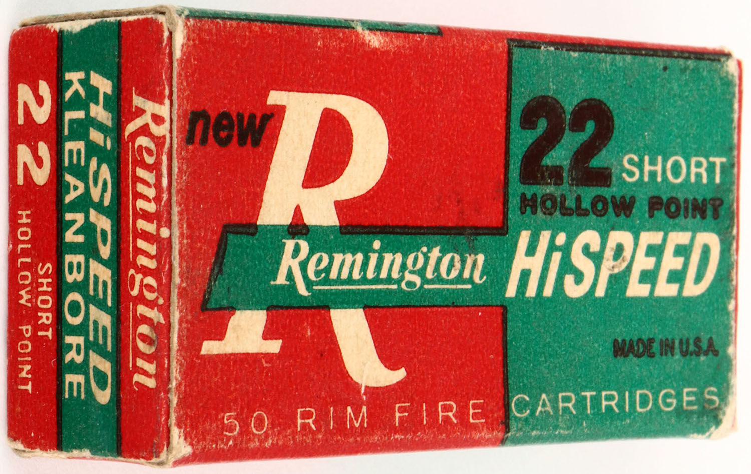 Remington, HiSpeed, .22 Short Hollow Point, RHWeb: REM-15 S-3, Full, 1pc. Red & green box, box is solid with very good color, some age soiling & corner wear, very minor edge wear, end flaps are solid, ammo is excellent. Grade: Excellent + - Value: 4 to 20