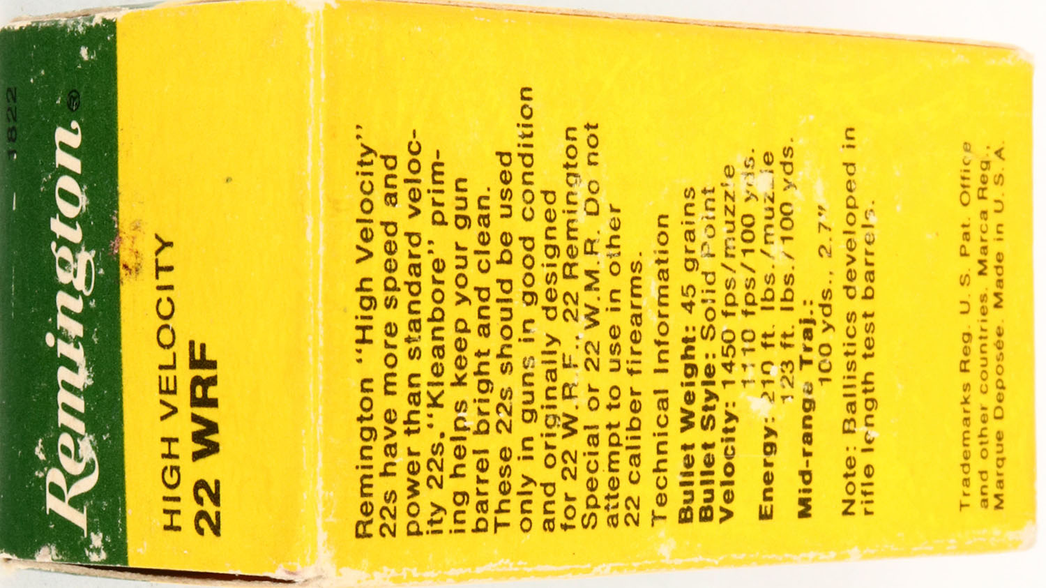 Remington, High Velocity, .22 WRF, RHWeb: REM-19 WRF-1a, Full, 1pc. Green & yellow box, box is solid with excellent color, minor shelf & corner wear, very minor edge wear, end flaps are solid, ammo is excellent. Grade: Excellent + - Value: 10 to 40