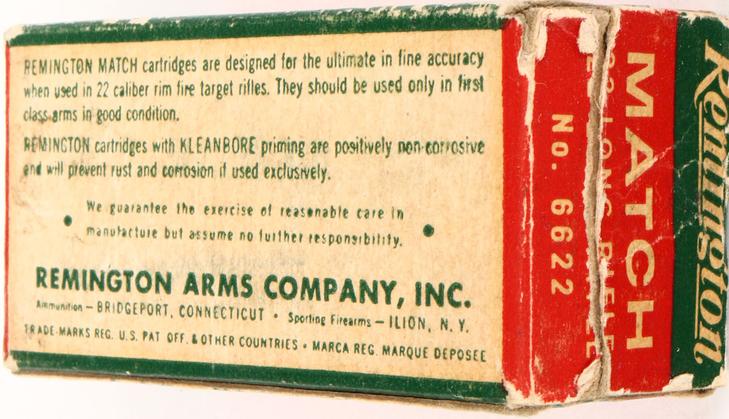 Remington, Match, .22 Long Rifle, Kleanbore, RHWeb: REM-54 LR-1a, Full, 1pc. Green red & white box, box is solid with excellent color, very minor age soiling, edge & corner wear, end flaps are somewhat rigid, partial seam split to top front edge, partial tear on right end flap, ammo is very good to excellent. Grade: Very Good ++ - Value: 10 to 50