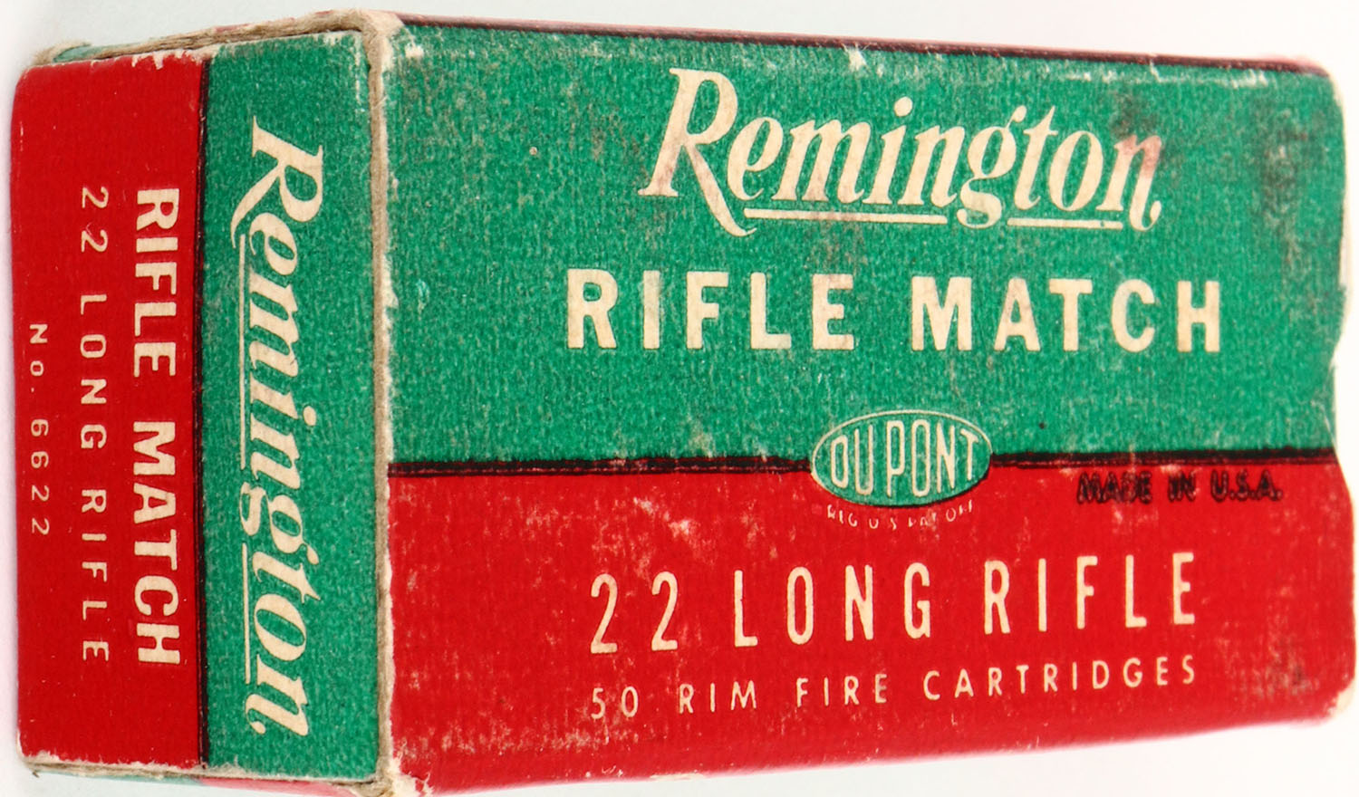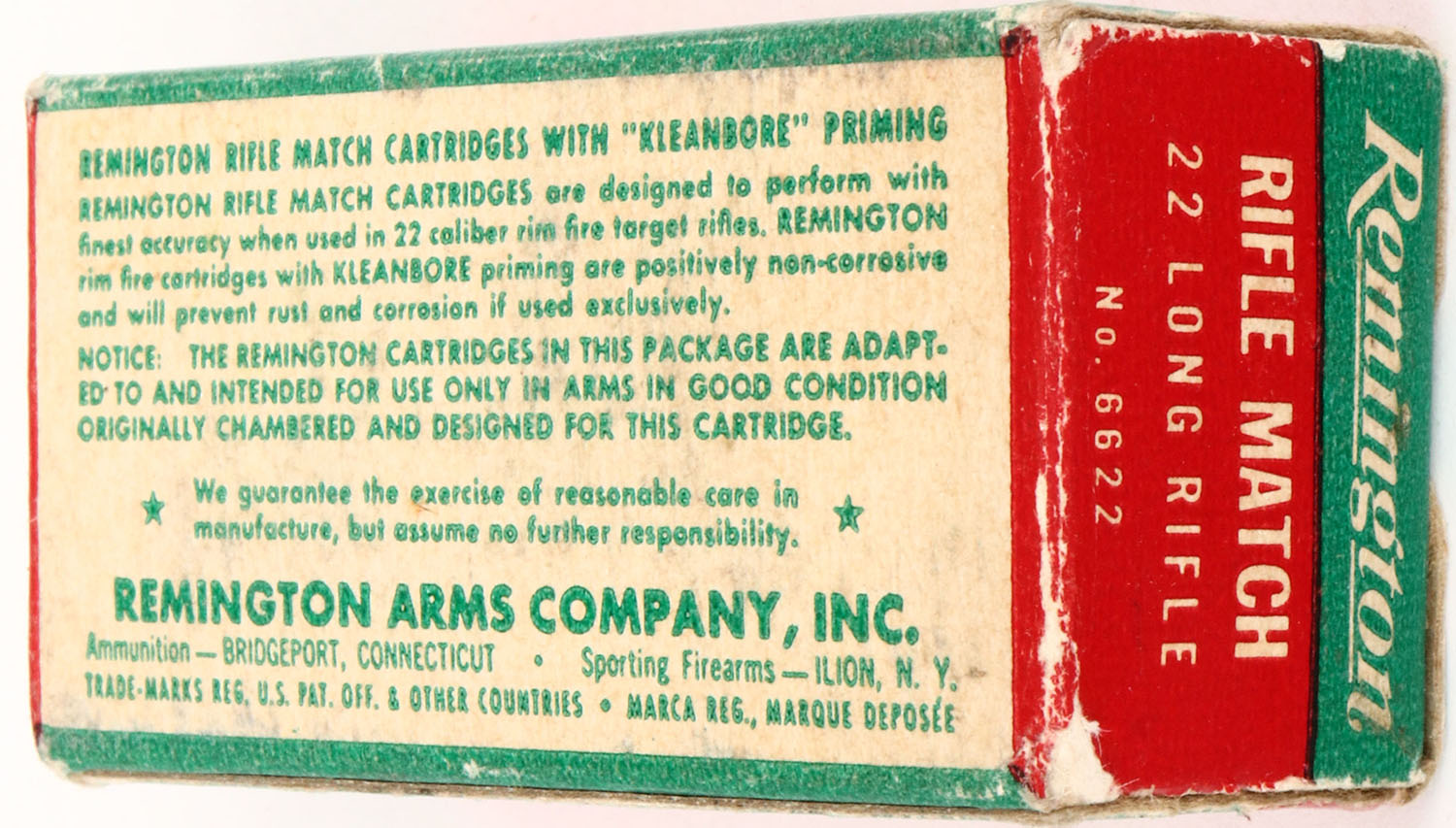 Remington, Rifle Match, .22 Long Rifle, Kleanbore, RHWeb: REM-54 LR-3b, Full, 1pc. Green red & white box, box is solid with very good to excellent color, very minor age soiling & corner wear, edges are crisp, end flaps are rigid, ammo is excellent. Grade: Excellent + - Value: 8 to 40