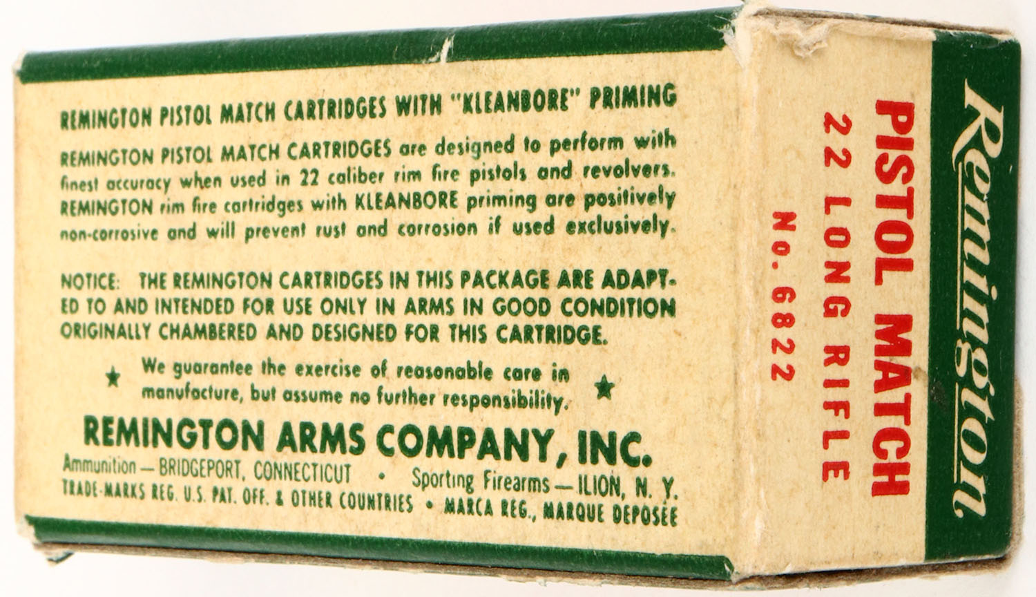 Remington, Pistol Match, .22 Long Rifle, RHWeb: REM-54 LR-4a, Full, 1pc. White & green box, box is solid with excellent color, some age soiling, minor edge & corner wear, end flaps are solid, ammo is excellent. Grade: Excellent + - Value: 4 to 20
