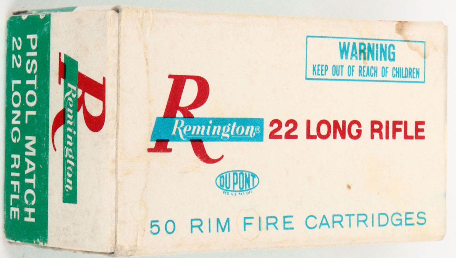 Remington, Pistol Match, .22 Long Rifle, Kleanbore, RHWeb: REM-54 LR-11b, Full, 1pc. White & green box, box is solid with excellent color, very minor age soiling, small stain on top, very minor corner wear, edges are crisp, end flaps are rigid, ammo is very good to excellent. Grade: Excellent - Value: 2 to 20
