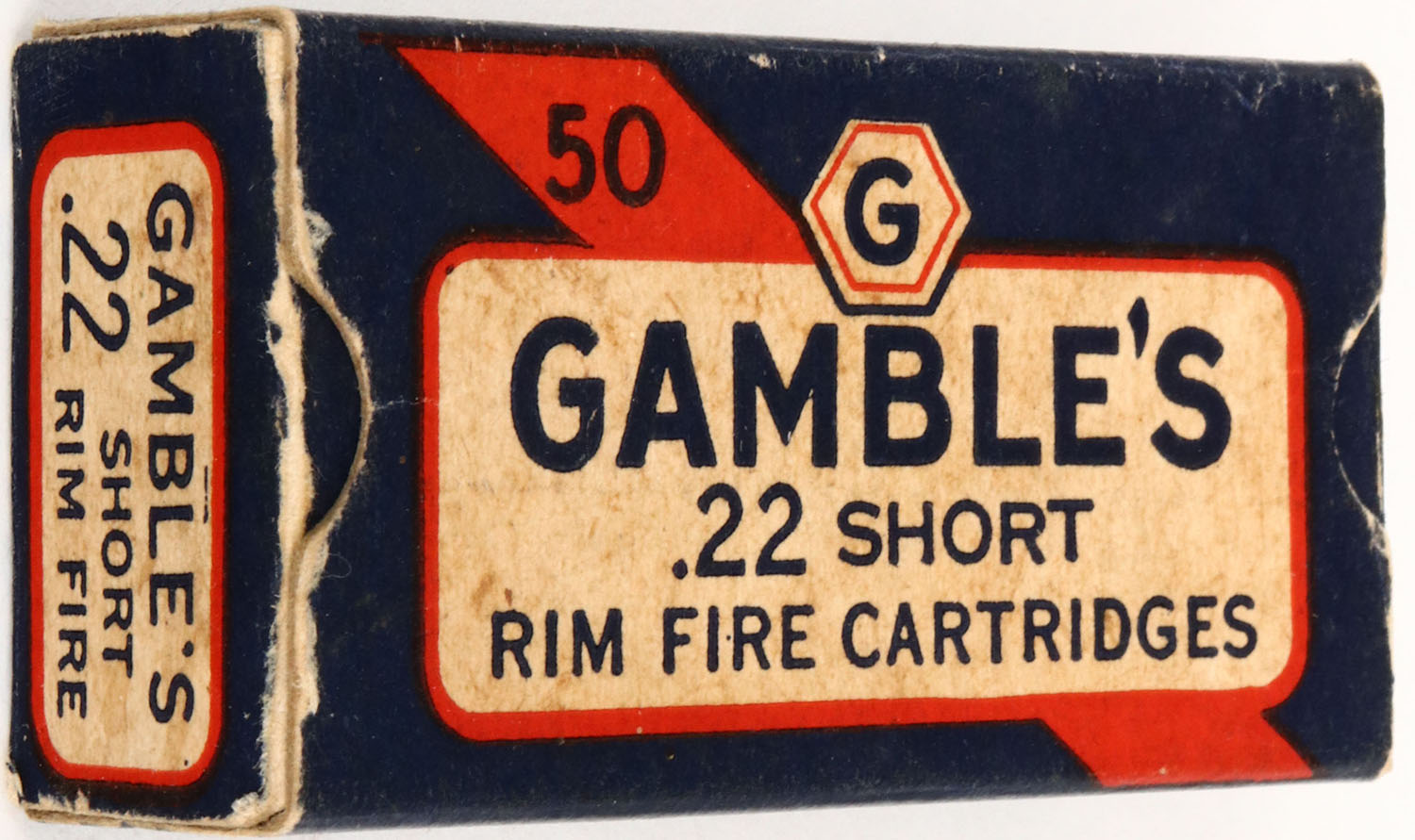 Gamble's, .22 Short, Rimfire Cartridges, RHWeb: GS-1 S-3, Full, 1pc. Blue white & red box, box is solid with excellent color, some age soiling, minor edge wear, corners are mostly sharp, end flaps are solid, ammo is very good. Grade: Excellent + - Value: 100 to 300