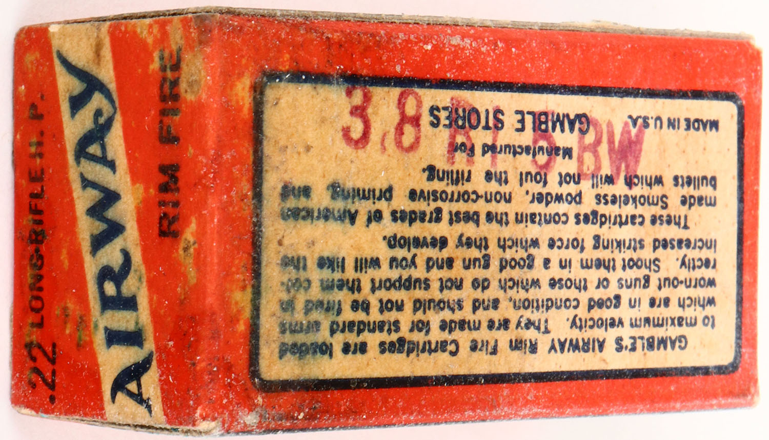 Gamble Stores, Airway, .22 Long Rifle Hollow Point, Peter's Manufacturing Rare Double Thumb Cut, RHWeb: GS-1 LR-2b, Full, 1pc. Red blue & white box, box is solid with excellent color, only very minor age soiling, some staining to bottom, corners are mostly sharp, edges are crisp, end flaps are rigid, ammo is fair. Grade: Excellent ++ - Value: 10 to 50