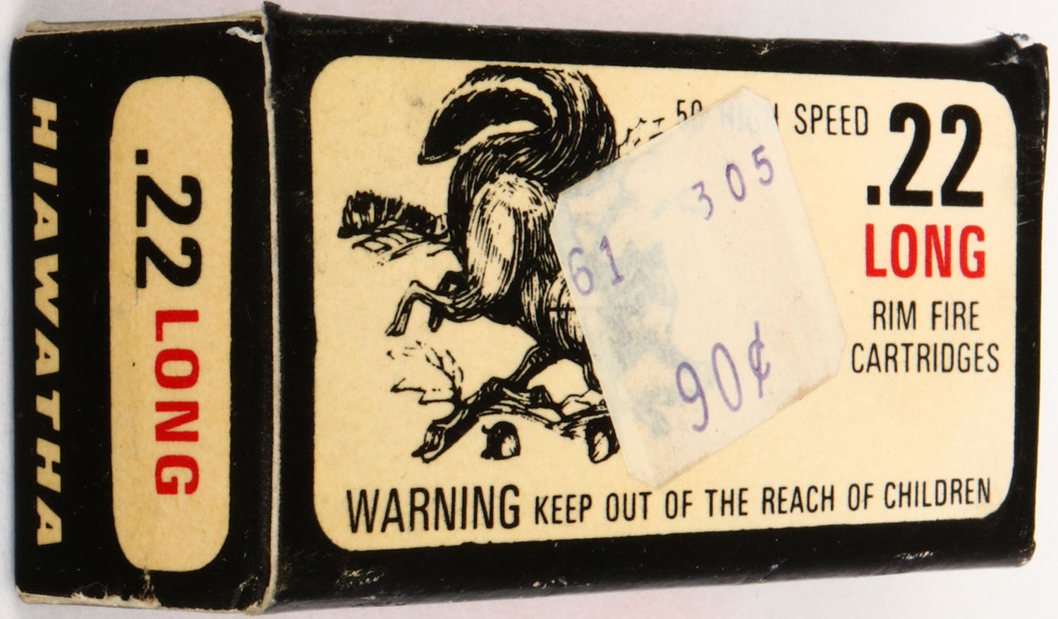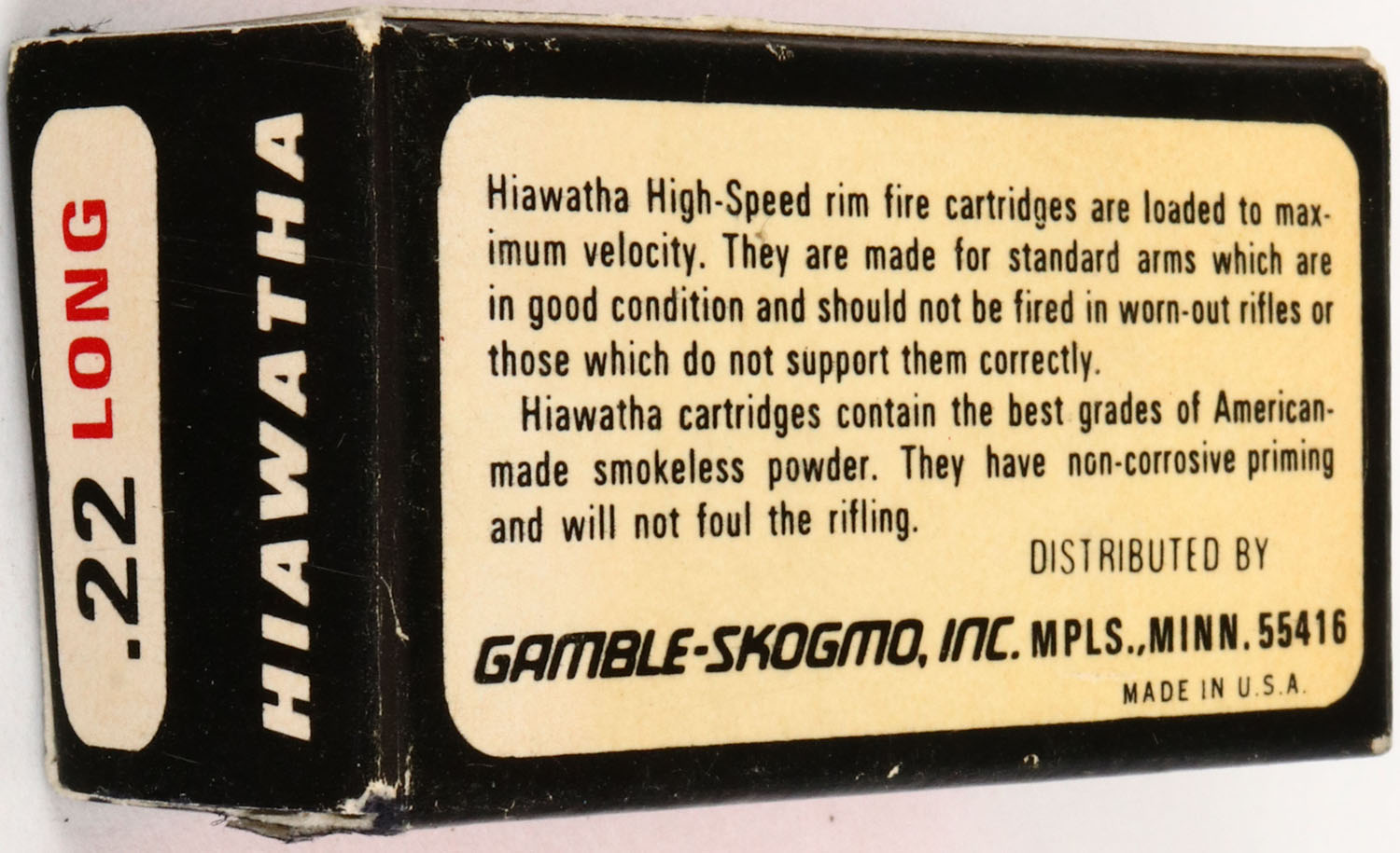 Gambles, Hiawatha, .22 Long, RHWeb: GS-5 L-1a, Full, 1pc. White black & red box, box is solid with excellent color, very minor age soiling & corner wear, edges are mostly crisp, end flaps are solid, price tag on top, ammo is minty. Grade: Excellent + - Value: 20 to 60