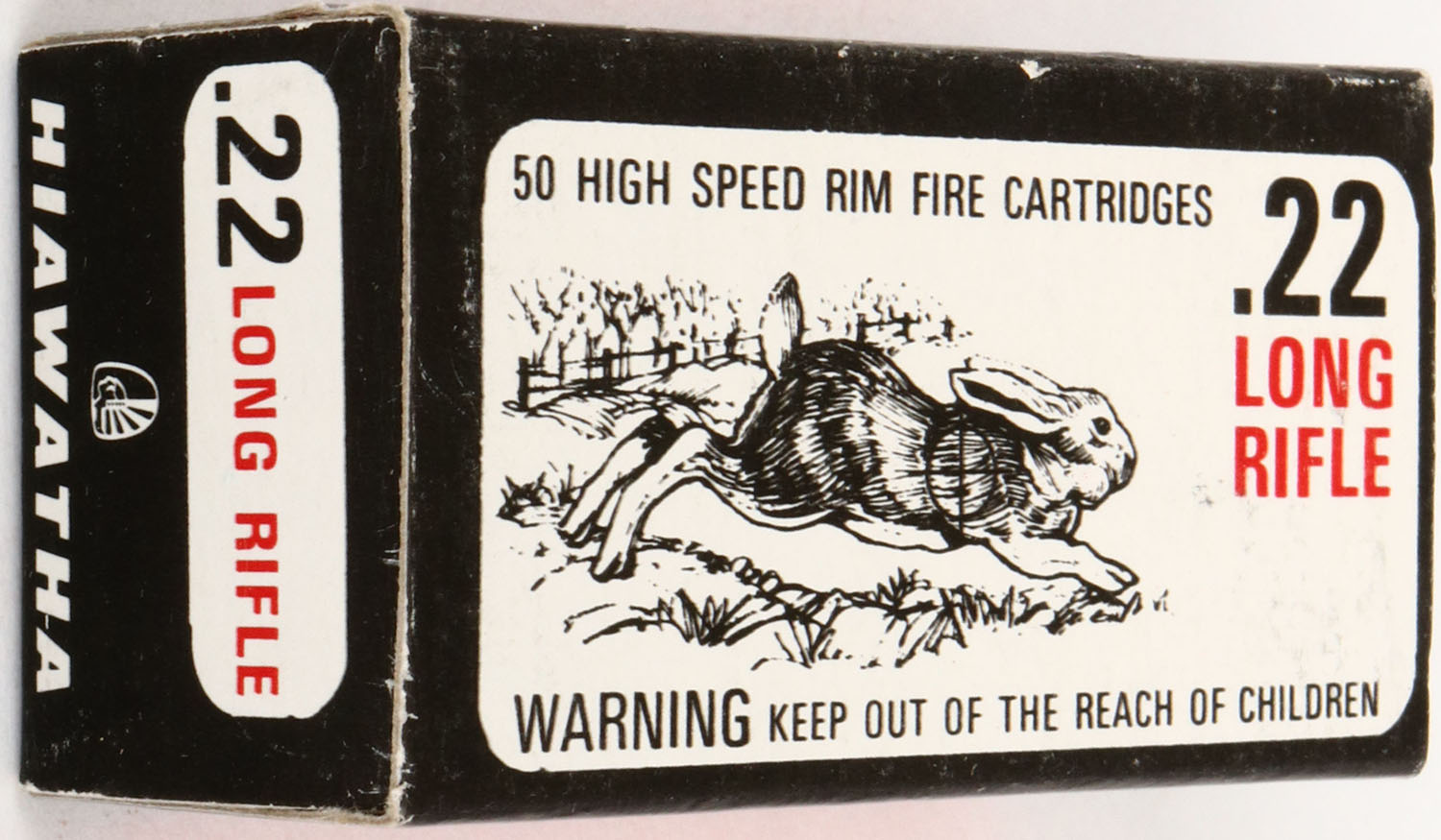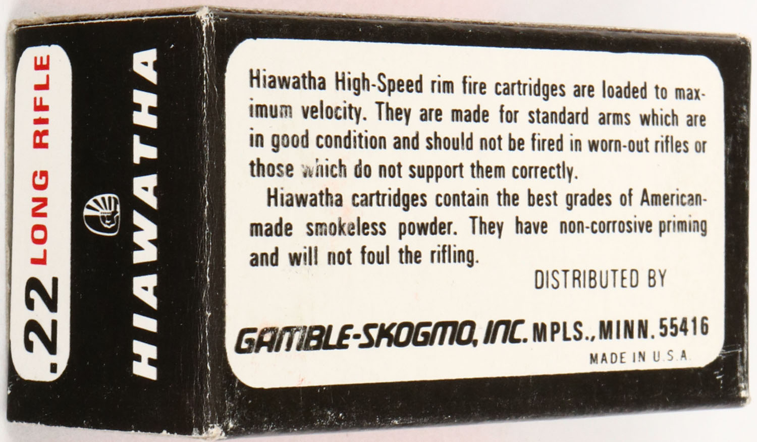 Gamble Stores, Hiawatha, .22 Long Rifle, RHWeb: GS-5 LR-1b, Full, 1pc. Black white & red rabbit box, box is solid with excellent to minty color, only very minor color fading, edges are sharp, edges are crisp, end flaps are rigid, ammo is minty. Grade: Excellent ++ - Value: 30 to 90