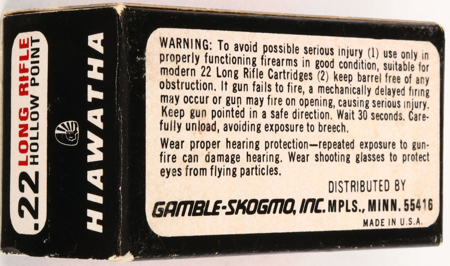Gamble Stores, Hiawatha, .22 Long Rifle Hollow Point, RHWeb: GS-5 LR-2c, Full, 1pc. Black white & red rabbit box, box is solid with excellent to minty color, scuff on top of box, very minor corner wear, edges are crisp, end flaps are rigid, ammo is minty. Grade: Excellent ++ - Value: 20 to 60