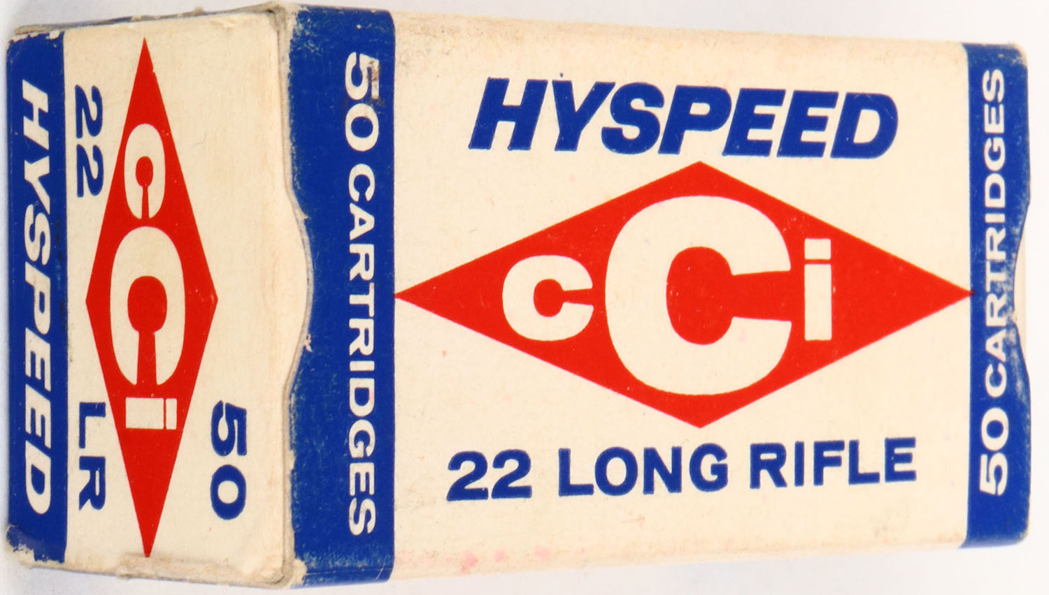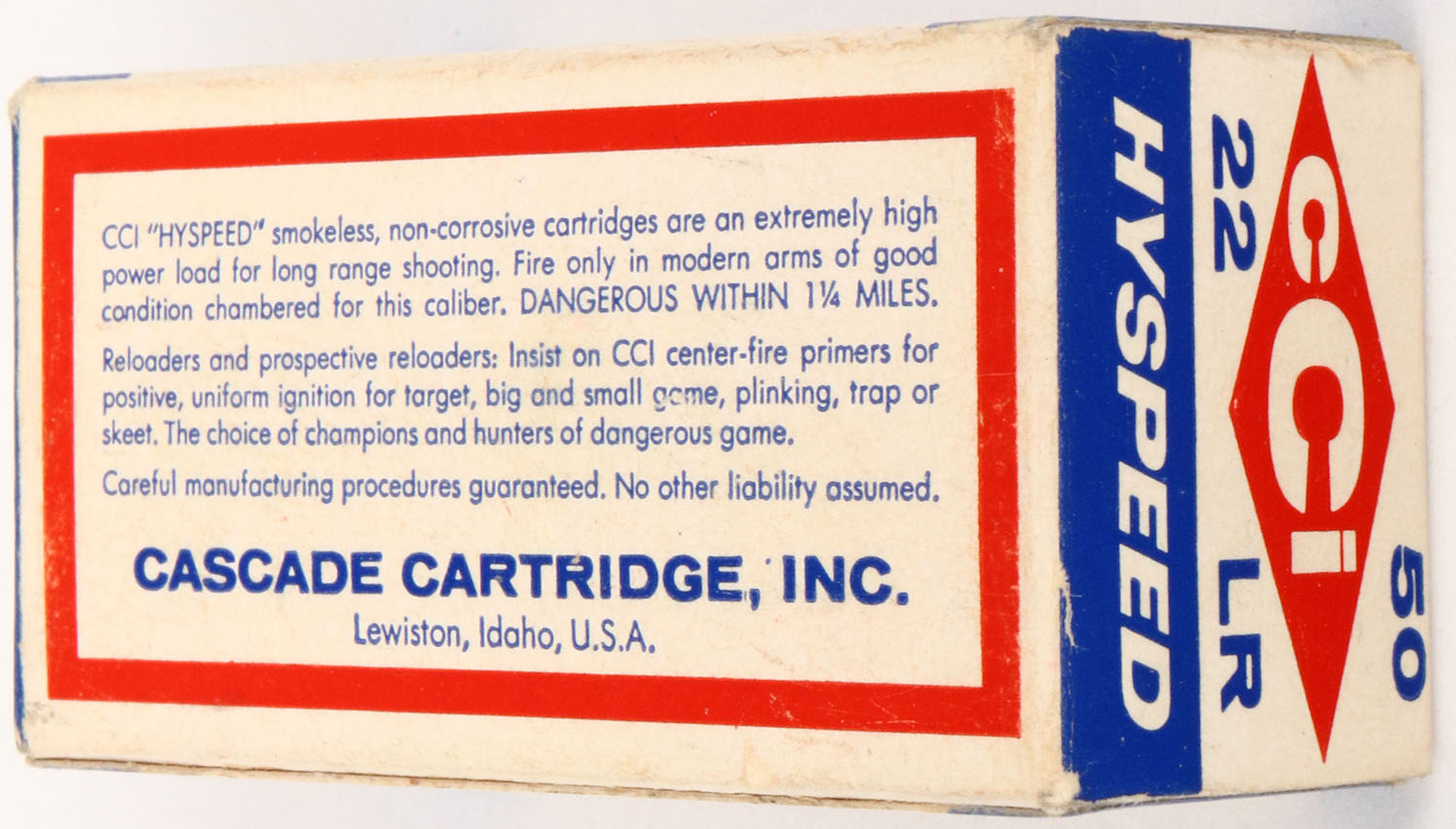 CCi, Hyspeed, .22 Long Rifle, RHWeb: CCI-1 LR-1, Full, 1pc. White blue & red box, box is solid with excellent to minty color, only very minor age soiling, very minor corner wear, edges are crisp, end flaps are rigid, ammo is excellent to minty. Grade: Excellent ++ - Value: 6 to 30