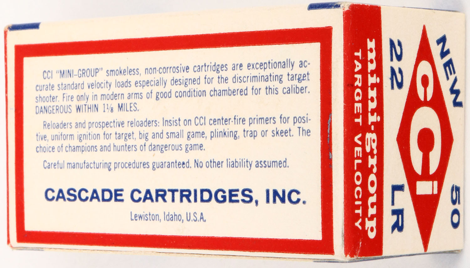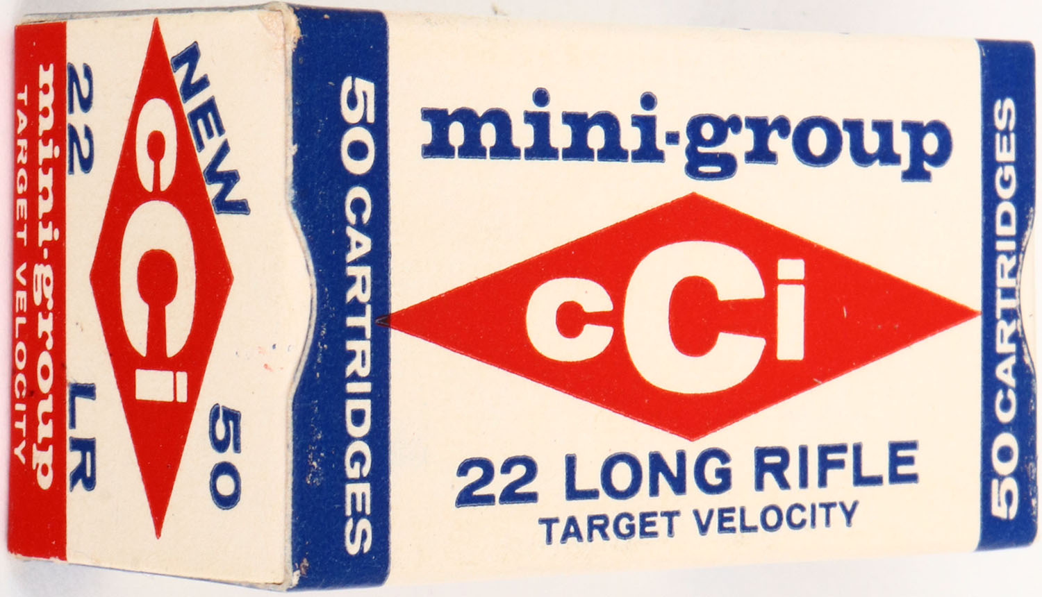 CCi, mini-group, .22 Long Rifle, Target Velocity, RHWeb: CCI-1 LR-10, Full, 1pc. White red & blue box, box is mint with mint color, corners and edges are sharp & crisp, end flaps are rigid, ammo is excellent. Grade: Mint - Value: 6 to 30